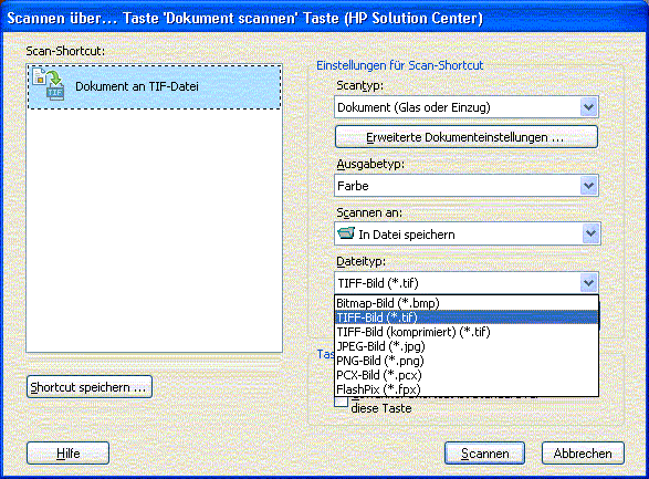 Voreingestellt ist TIFF, weitere Möglichkeiten sind: Siehe Bild im Anhang.