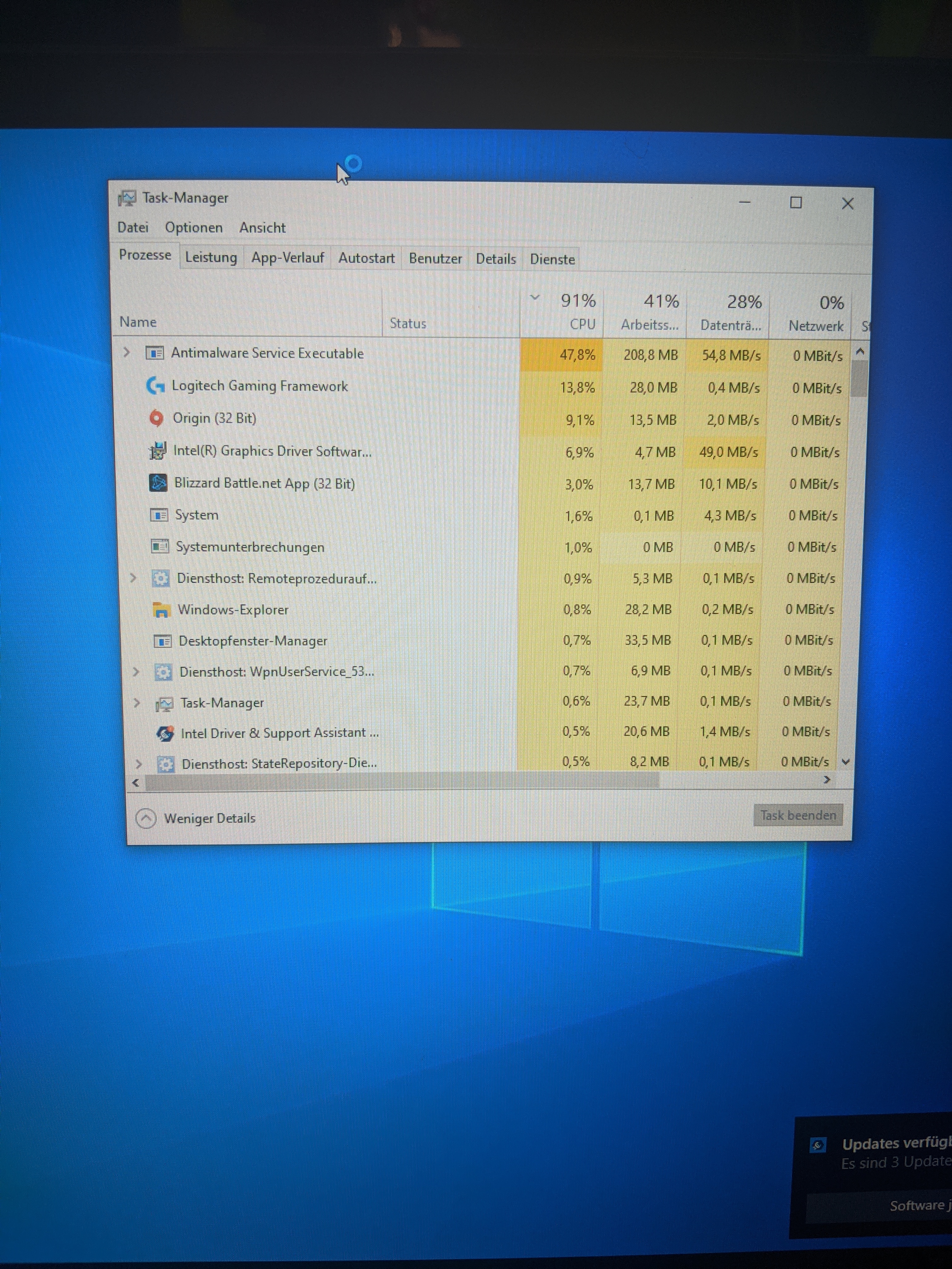 Ich habe das Problem, dass der cpu immer ausgelastet ist. Also quasi immer unter last. Manchmal zu 100 Prozent. Leider wird mir kein Prozess beim Taskmanager angezeigt,der das auslösen könnte. Wenn ich ihm direkt beim Start Aufrufe ist er direkt bei 100%.Spiele laufen dadurch z.b nur abgehakt.
