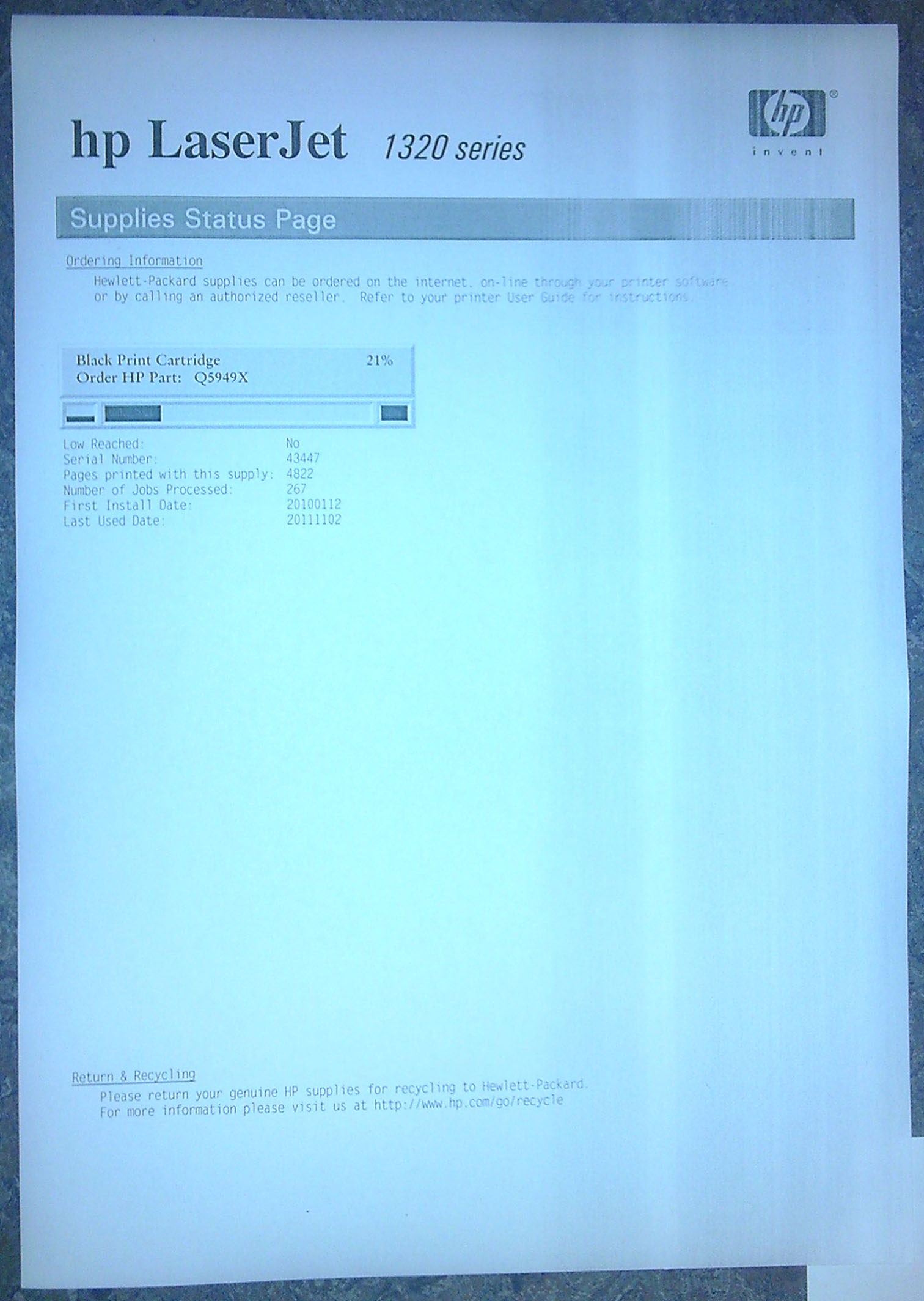 habe ein Problem mit meinem HP LaserJet 1320. Dieser druckt auf jeder Seite Schlieren mit. Habe euch zwei Fotos von der Statusseite zur Veranschaulichung angehängt. Die Streifen sind in der Realität etwas dunkler als auf den Bildern. Der Drucker ist jetzt bei 17000 Seiten, der Toner bei knapp 5000 und 21% Füllstand.