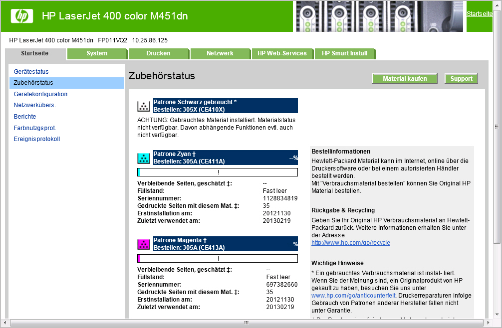 Nach der Inbetriebnahme durch die mitgelieferten Toner funktionierte das Gerät ohne Probleme. Leider erkennt der Drucker nun nach ca. drei Monaten nicht mehr die Kartuschen, im Druckerdisplay werden diese bei der Füllstandsanzeige mit einem Fragezeigen angezeigt. Über die Web-Oberfläche wird mir z. B. bei den Farbkartuschen gemeldet, dass diese (nach 35 Frabausdrucken!) fast leer sind. Eine neu installierte orginal-HP Kartusche (CE410X) wird mir als nicht original angezeigt, siehe Screenshot: