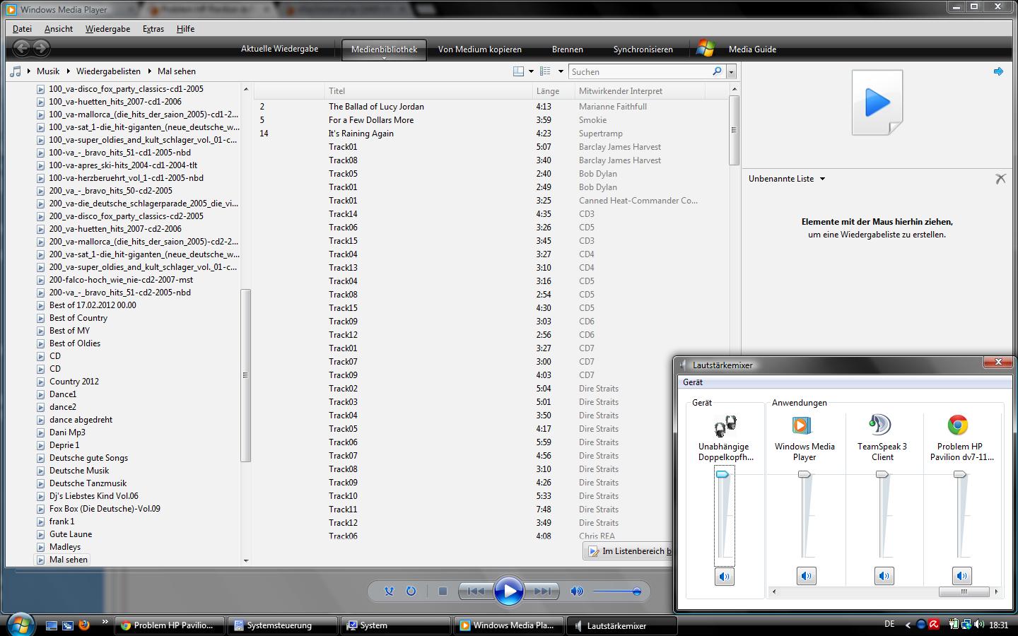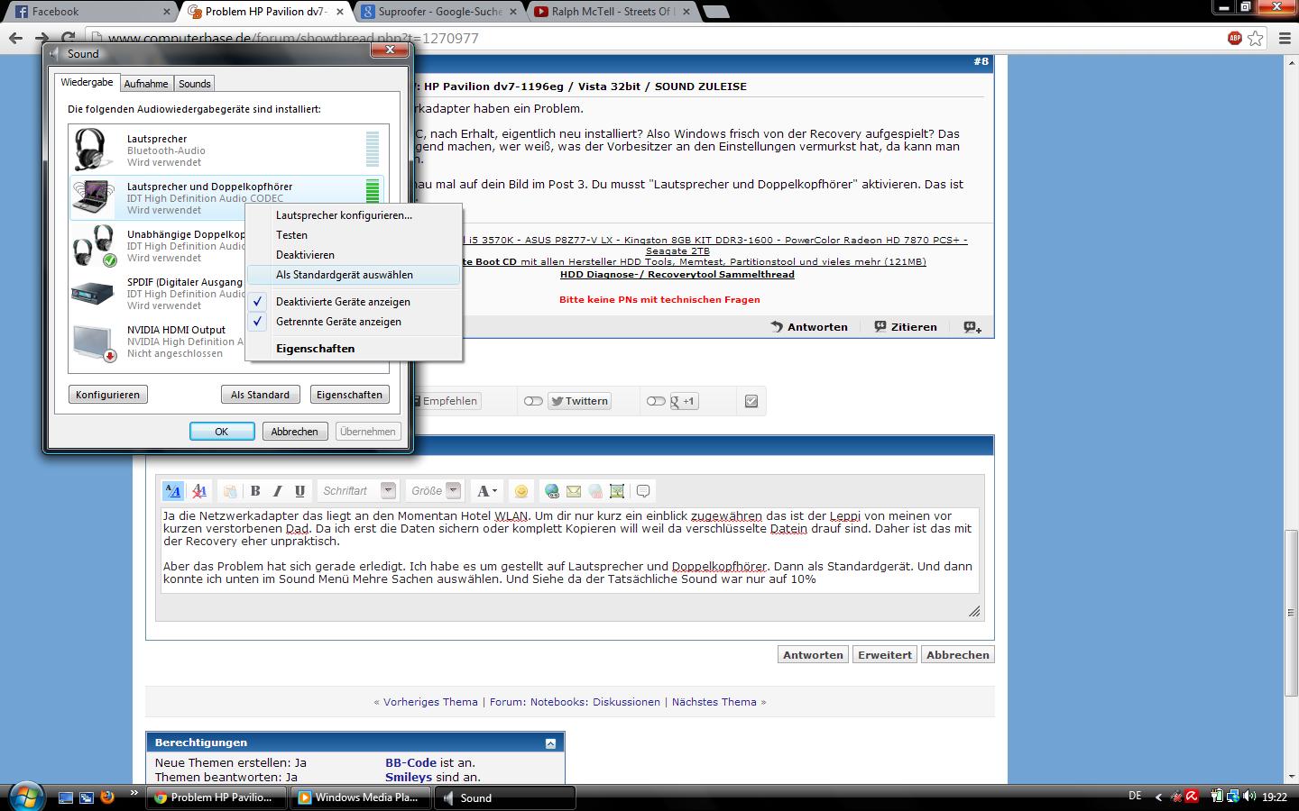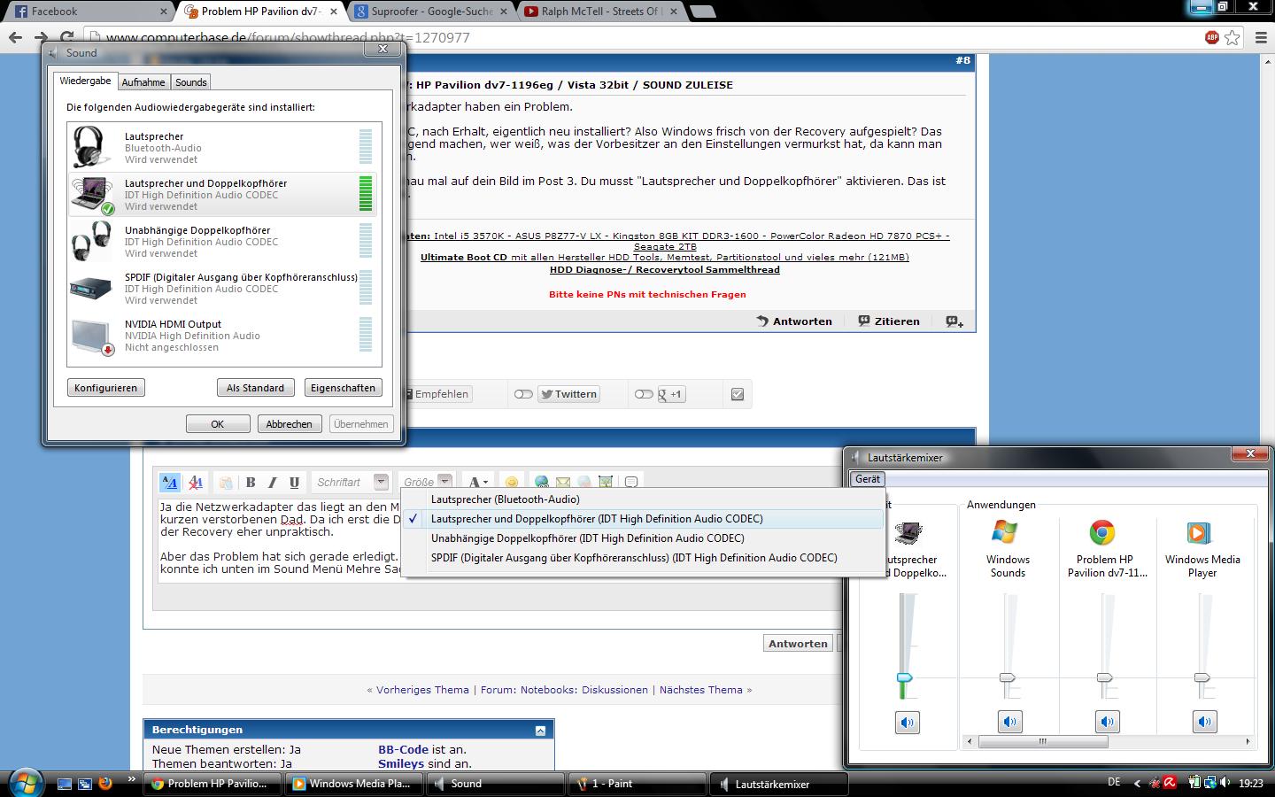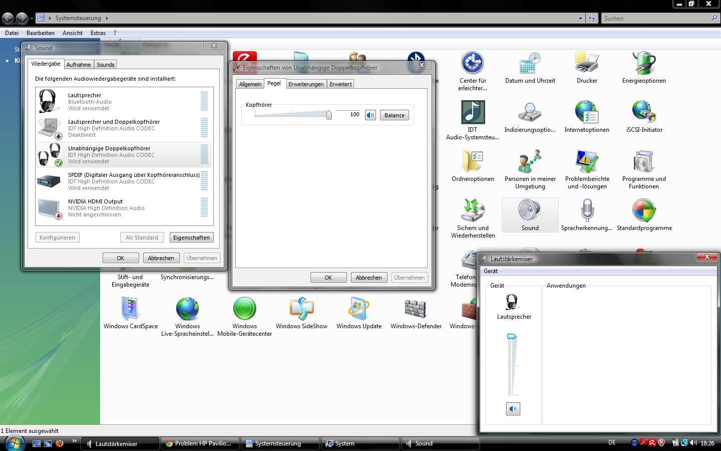 Wie oben in kurz beschrieben steht ist bei mein HP der sound verdammt leise. Man kann zwar was hören aber ich bin der Meinung das dass irgendwo aus gebremst wurde... Ich höre es momentan über ein Billig hs auch wenn ich ein anderes nehme wird der Sound nicht lauter. Also hab ich das schon mal aus geschlossen. Hab auch gerade via Window nach Treiber gesucht sind die Aktuellen vorhanden. Wenn ich den Media Player öffne und Musik starte ist es zu leise. Vielleicht ist es auch ja nur eine kleine einstellung aber ich bin mit meinen Latin am ende. Hoffe ihr habt damit erfahrung und könnt mir weiterhelfen
