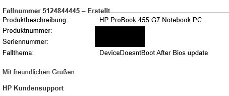 Sieh dir in dem Thread Post #4 an. Dort angehängt ist ein lauffähiges BIOS für ein Probook 455 G7 (D0X9MMB8F0 - bitte überprüfe ob das identisch mit der Kennung auf deinem Mainboard ist!). Da der Thread schon ein halbes Jahr alt ist, könnte es sich durchaus auch um eine ältere BIOS-Version handeln, als die "problematische" aktuelle.