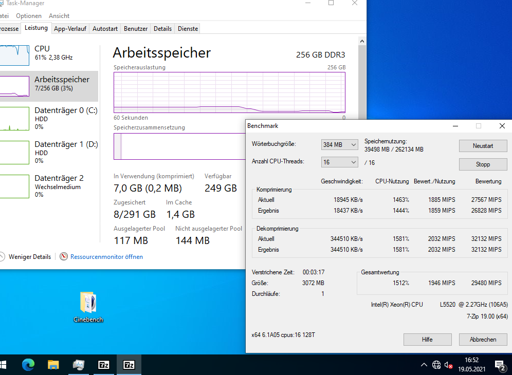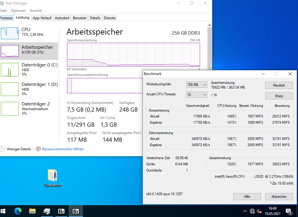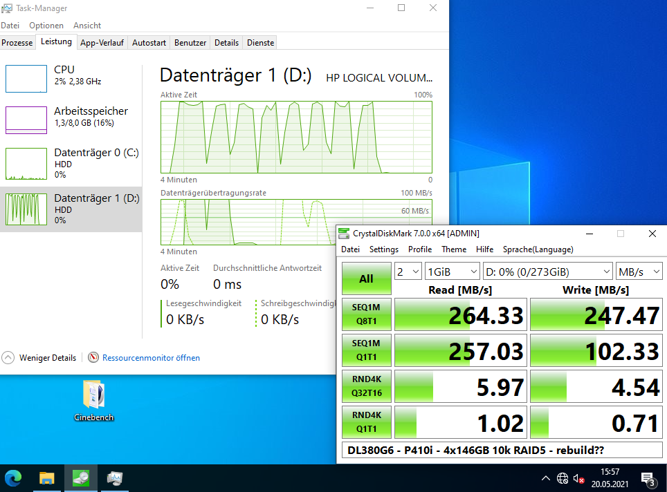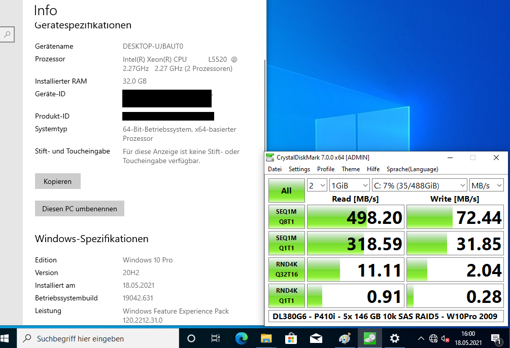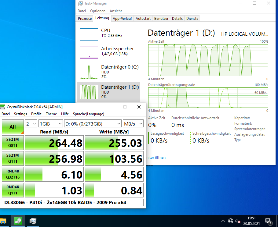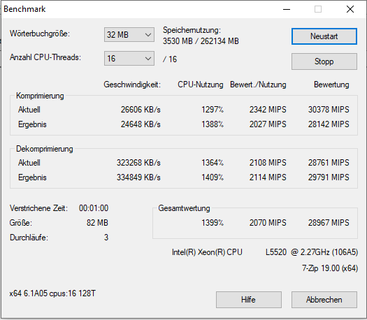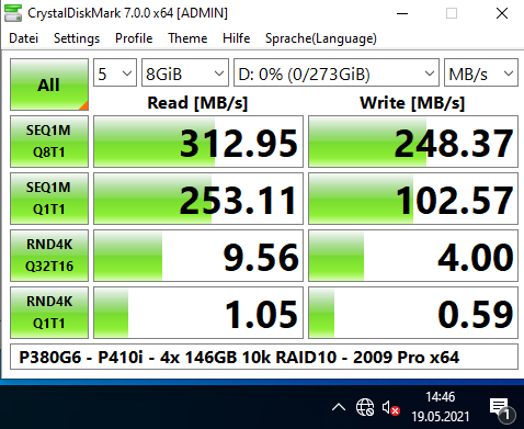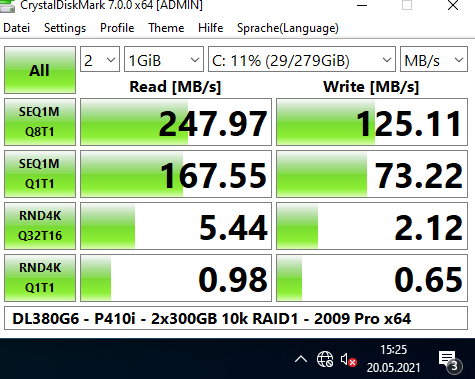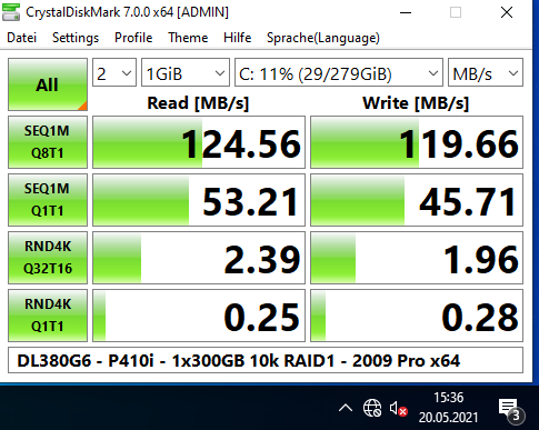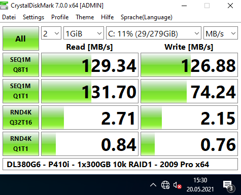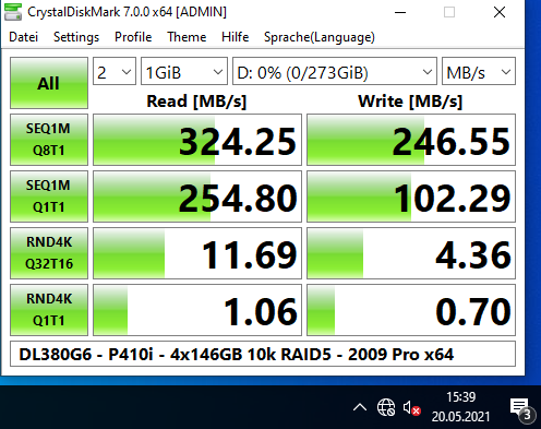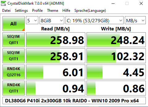 Ich habe auch etliche Benchmarks (Crystal Disk Mark, Cinebench, Prime95, 7Zip) damit gemacht, mit 2x L5520 (4-Kerne), verschiedenen Speicherkonfigurationen (8 GB mit 2x 4 GB; 64 GB mit 16x 4 GB; 256 GB mit 16x 16 GB) und RAID-Levels (5x 146 GB im RAID5; 2x 146 oder 300 GB im RAID1, 2x 300 GB im RAID0, und 4x 146 GB im RAID10). Was die Performance angeht, kann er nicht einmal mit einem älteren i7 mithalten (siehe auch die Screenshots).