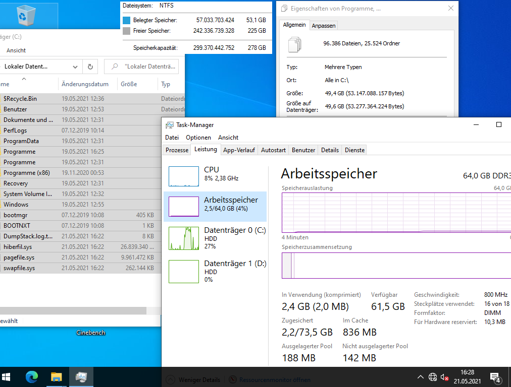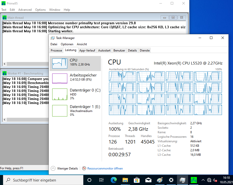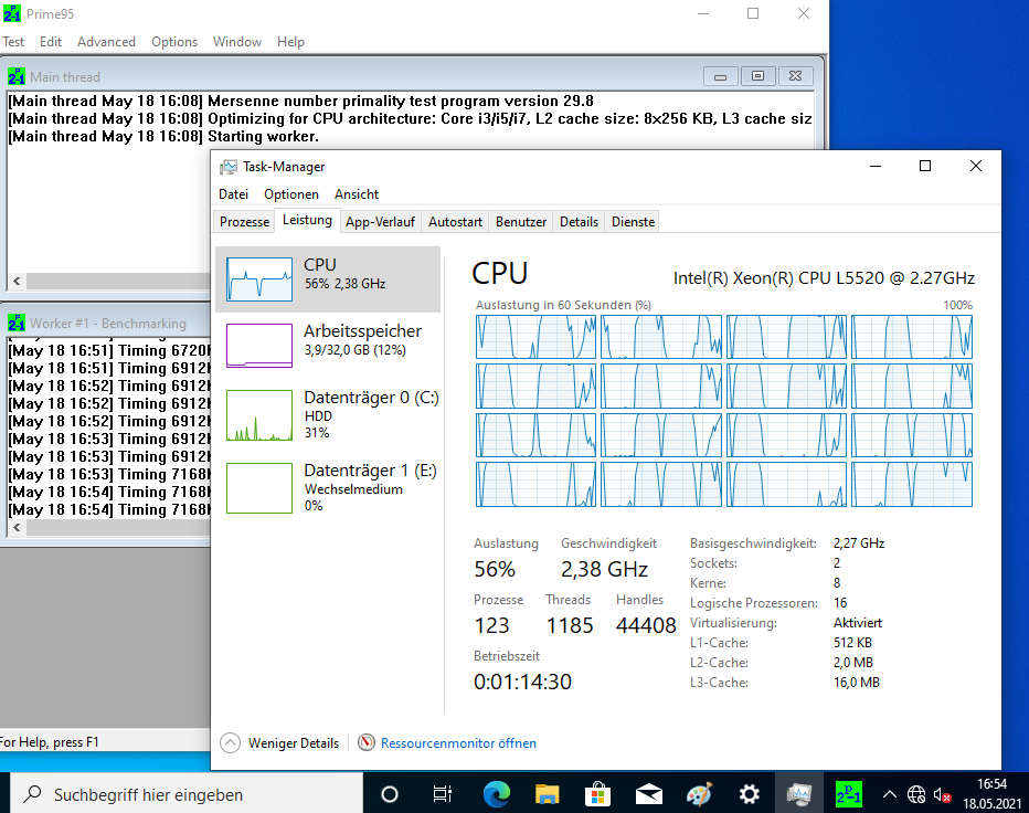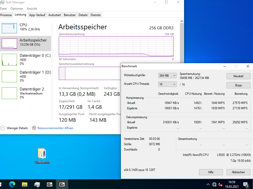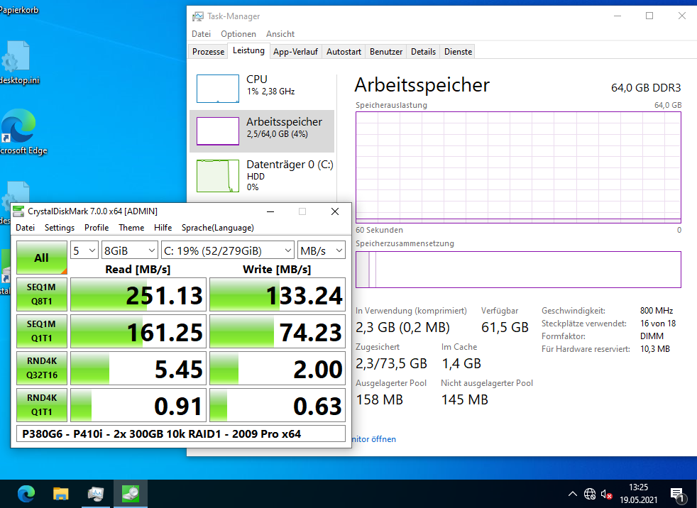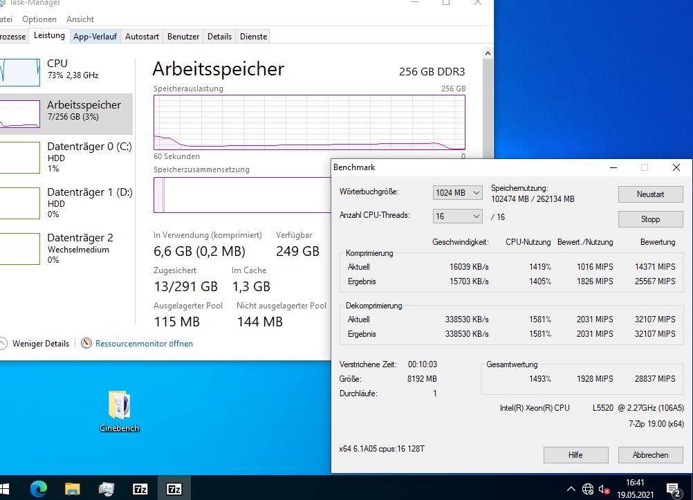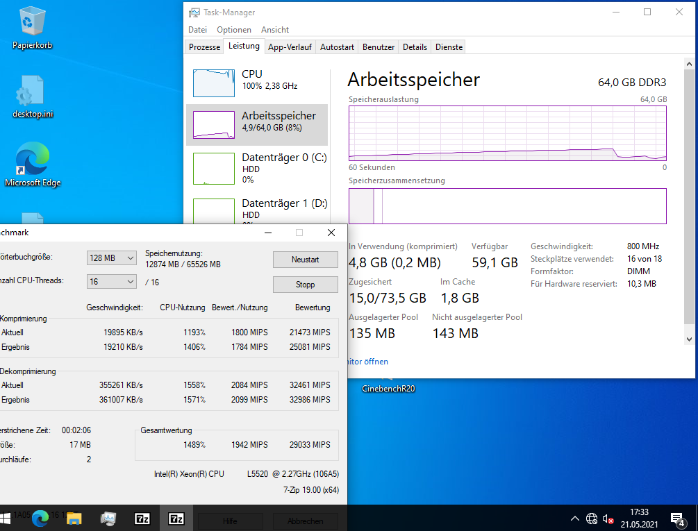 Ich habe auch etliche Benchmarks (Crystal Disk Mark, Cinebench, Prime95, 7Zip) damit gemacht, mit 2x L5520 (4-Kerne), verschiedenen Speicherkonfigurationen (8 GB mit 2x 4 GB; 64 GB mit 16x 4 GB; 256 GB mit 16x 16 GB) und RAID-Levels (5x 146 GB im RAID5; 2x 146 oder 300 GB im RAID1, 2x 300 GB im RAID0, und 4x 146 GB im RAID10). Was die Performance angeht, kann er nicht einmal mit einem älteren i7 mithalten (siehe auch die Screenshots).