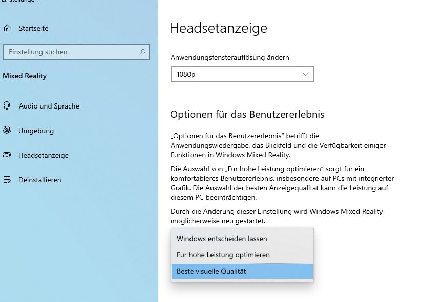Soweit ich mich erinnern kann stand der Schalter standardmäßig auf "Windows entscheiden lassen". Stellt ihn einfach auf "Beste visuelle Qualität" und euch steht das maximal mögliche horizontale FOV zur Verfügung. Die anderen Optionen wie Auflösung oder Frequenz scheinen keine Auswirkung zu haben.