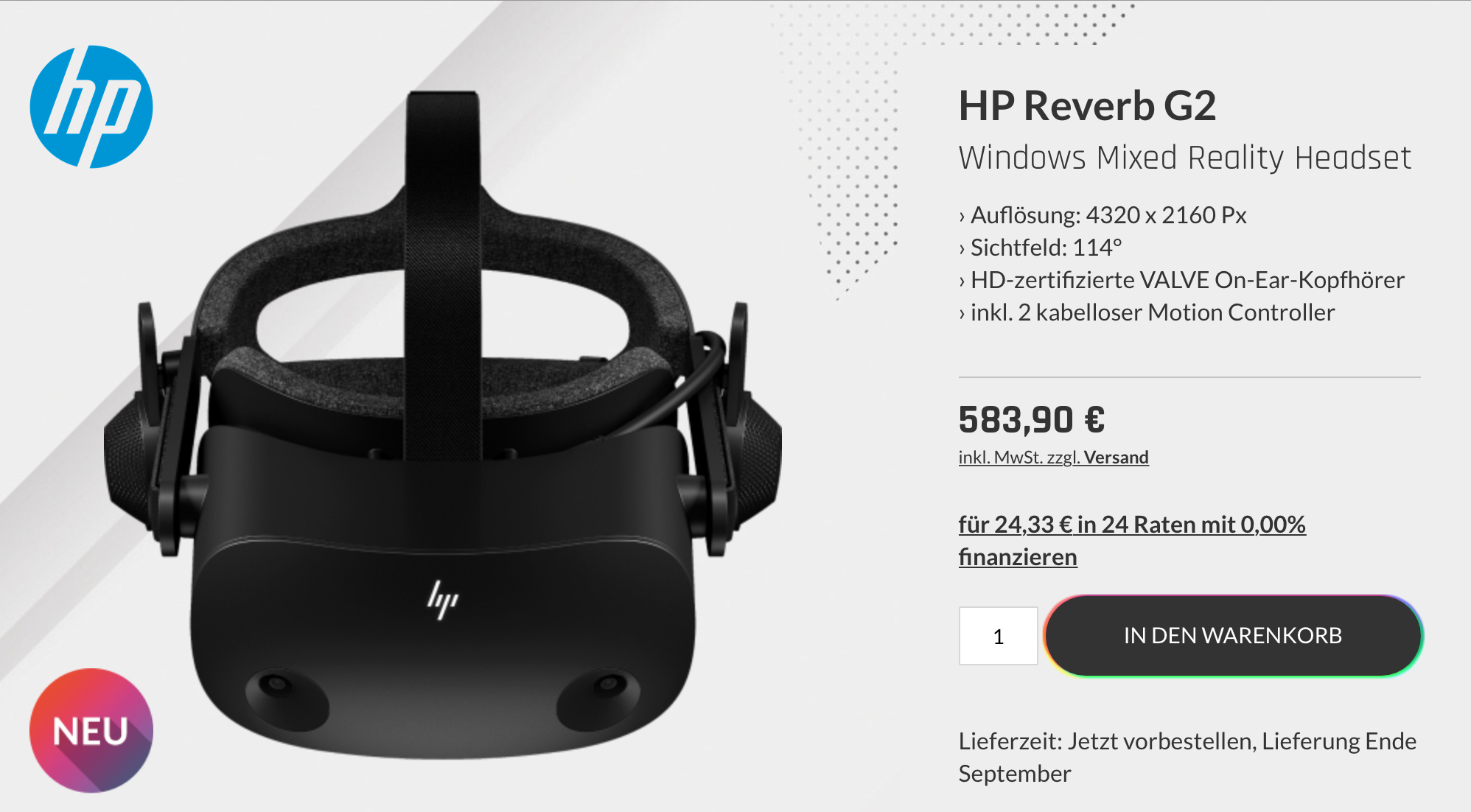 Uns liegen keine Informationen darüber vor, wann die neue HP Reverb G2 in unserem Shop online gespielt wird. Preisauskünfte und Vorbestellungen sind zum jetzigen Zeitpunkt nicht möglich.