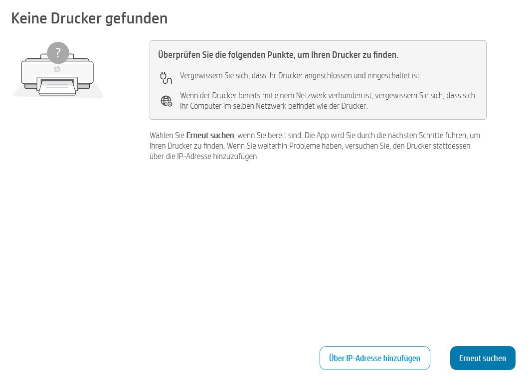 Nächstes Problem: Öffne ich den HP Smart und suche meinen Drucker dann zeigt sich das hier: