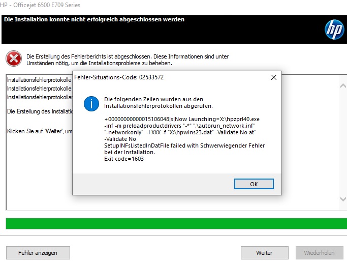 Allerdings bricht jedes mal die Installation mit einem schwerwiegenden Fehler ab.