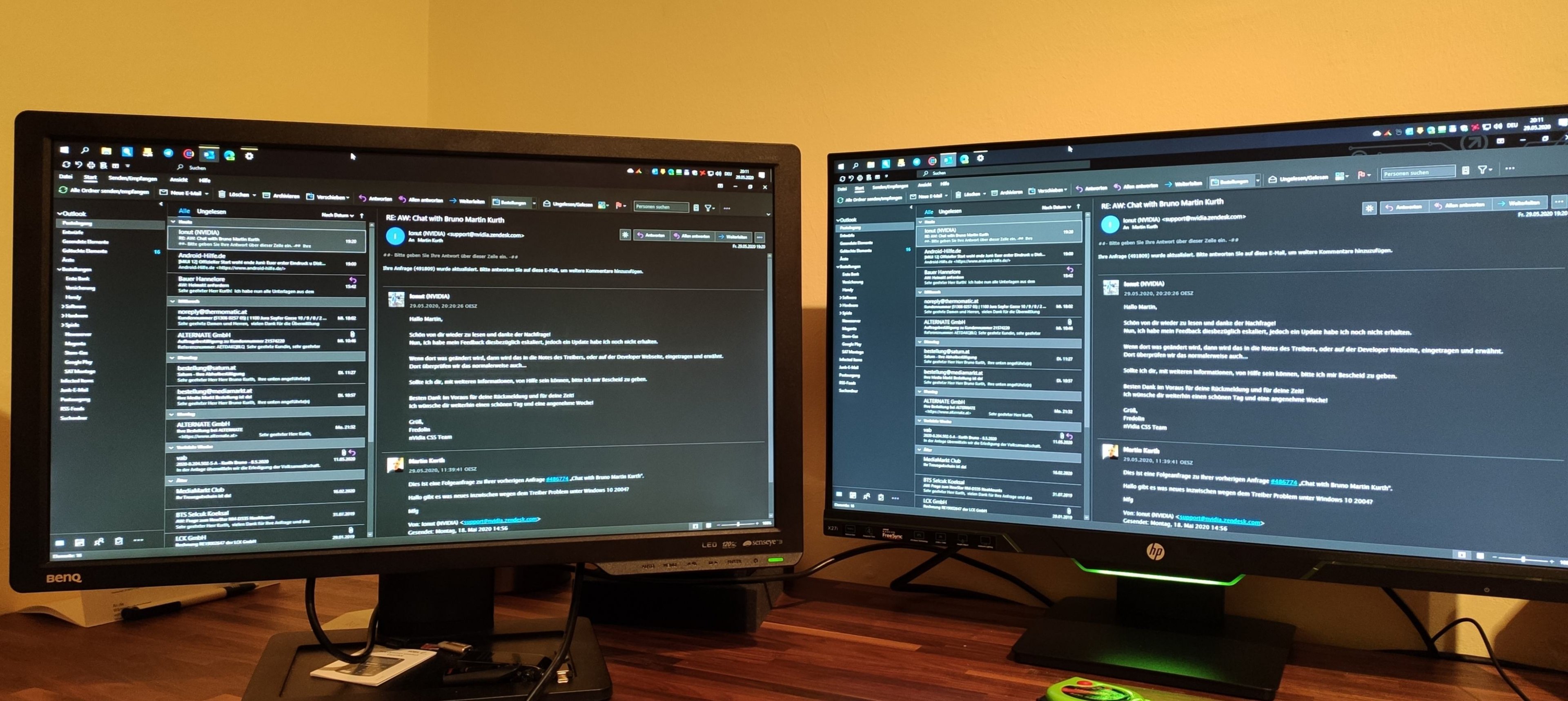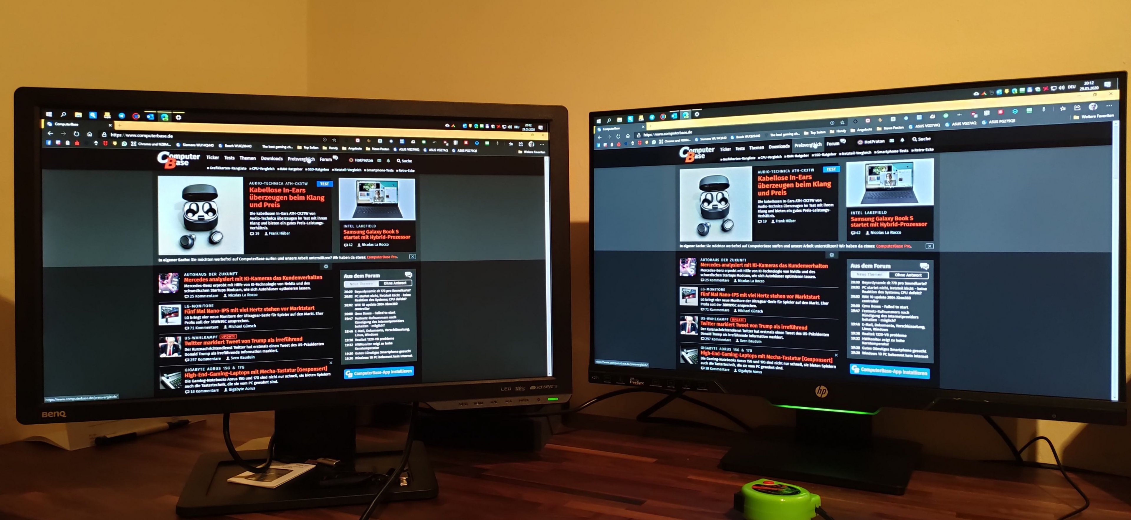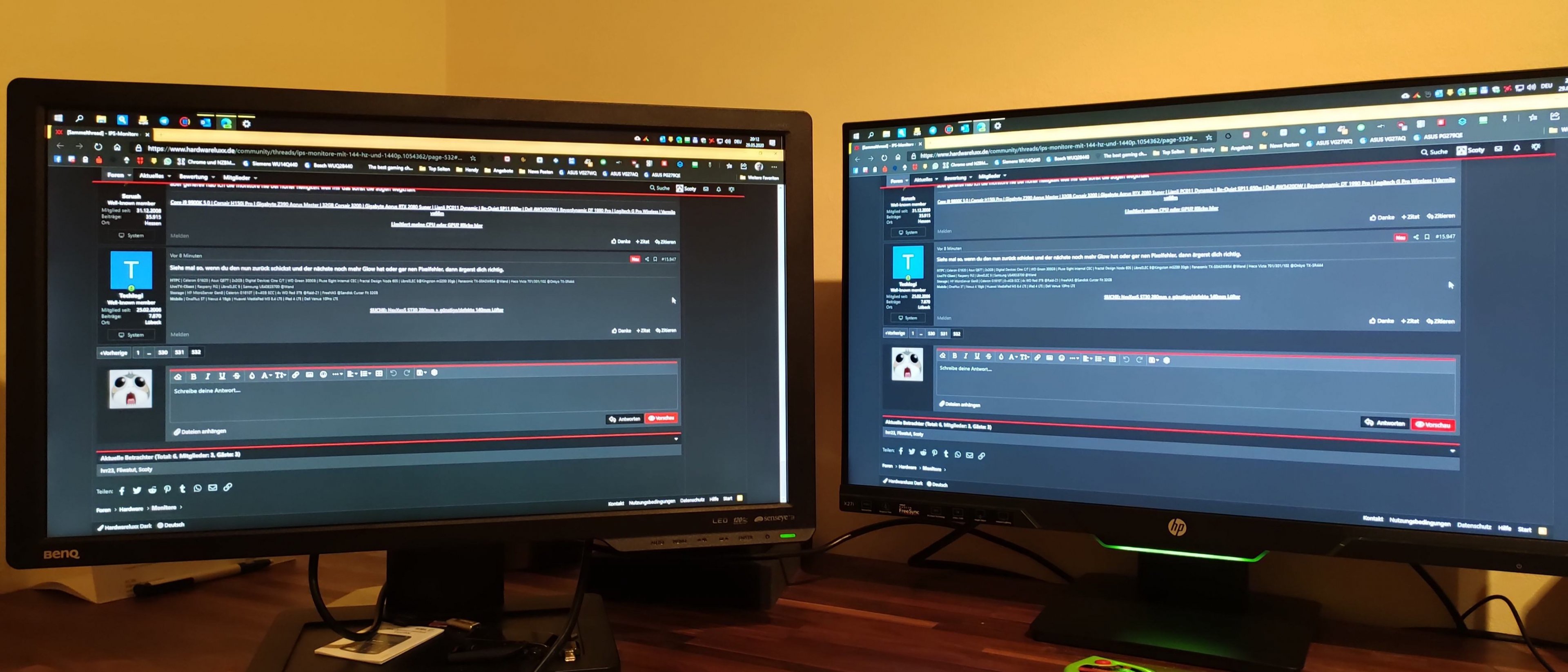 Bei uns ist das Wetter gerade echt schlecht daher auch dunkel im Zimmer und da sieht man die rechte untere Ecke bei schwarzen Bild bzw. Inhalten schon deutlicher aber bei weiten nicht so wie beim Aorus oder LG und es ist etwas gelblicher dann. Mit mehr Licht im Zimmer von oben scheint es nicht so gelblich siehe 3. Bild und da ist es real nur noch schwach zu sehen was man nur bei dunklem Inhalt noch erkennen kann. Bin auf Helligkeit 35 inzwischen auch runter denn auf Standard 90 wird man erstens Blind und zweitens ist da das Glow bzw. BLB für mich dann zu extrem. Mein BenQ war immer auf 50 eingestellt, auch da ist es beim HP für mich noch immer zu stark sichtbar. Bin echt hin und hergerissen. Behalten, eventuell tauschen und hoffen das ich noch einen etwas besseren bekomme wo weniger Glow bzw. BLB auf der rechten Seite ist bzw. die Helligkeit besser ist???