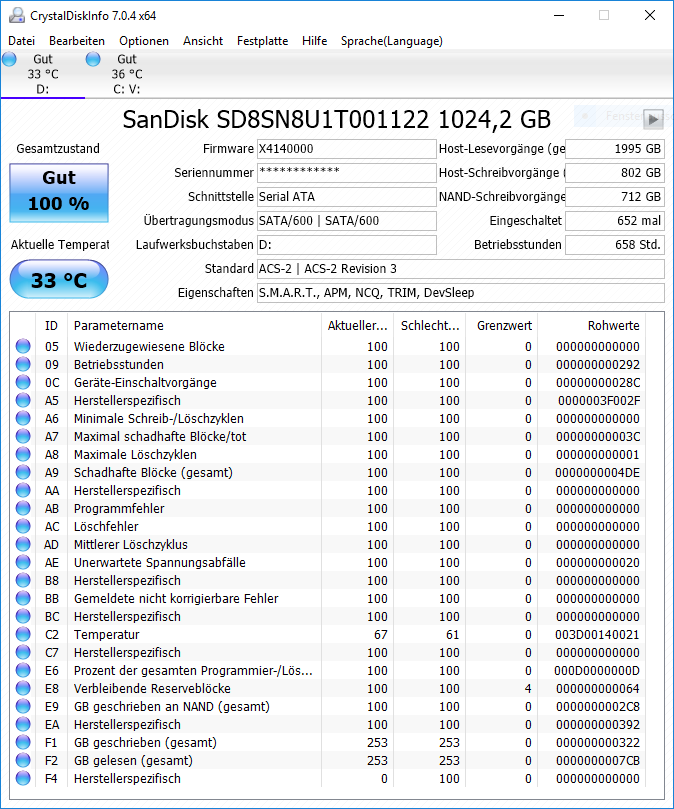 Daraus werde ich aber nicht wirklich schlau, das SanDisk SSD Dashboard zeigt beim SMART-"Kurztest" folgendes an:
