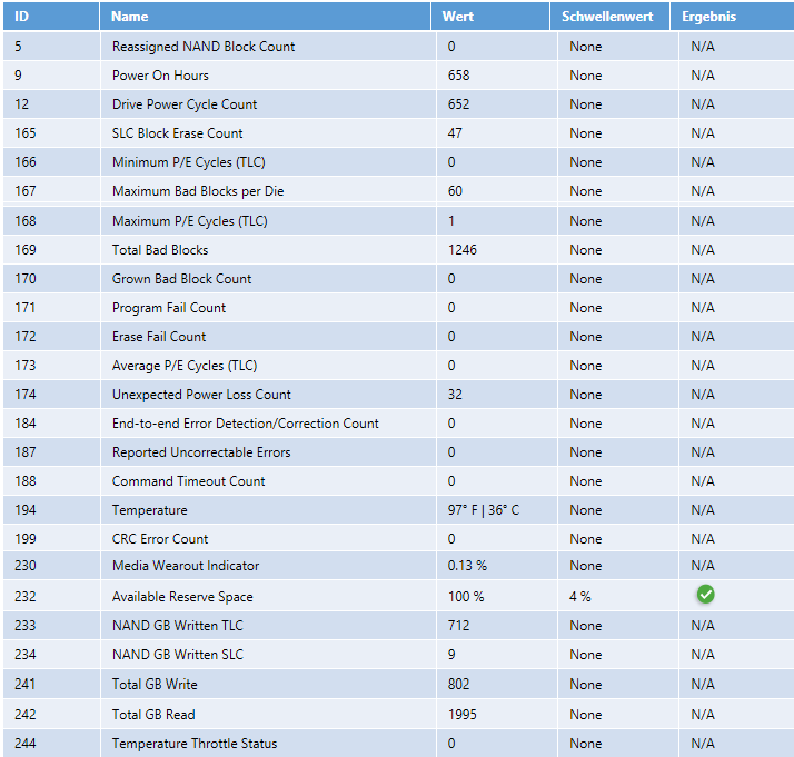 Ich habe eine zweite M.2 SSD eingebaut, auf der sich meine Daten befinden. In letzter Zeit fällt mir auf, dass hin und wieder das Speichern in Word, Adobe Reader o.ä. extrem lange dauert. Es ist nicht immer so, sondern geschätzt jedes 5te bis 10te Speichern. Um ein Problem der SSD auszuschließen habe ich mit CrystalDiskInfo die SMART-Werte ausgelesen: