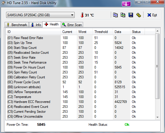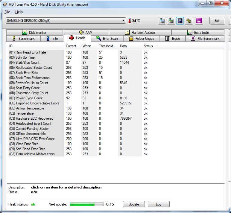 Nun ja, beim "Reported Uncorrectable Errors"-Attribut steht der aktuelle Wert (Current) bei 1 und der Schwellwert (Threshold) ist 0. Unterschreitet, oder wie in diesem Fall, zieht der aktuelle Wert mit den Schwellwert gleich, sieht der Hersteller die Platte definitiv als defekt an. Der aktuelle Wert ist also bereits bedenklich niedrig.