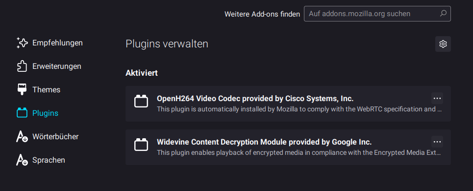 DRM Unterstützung ist aktiviert und das OpenH264 Plugin ist installiert und aktiviert.