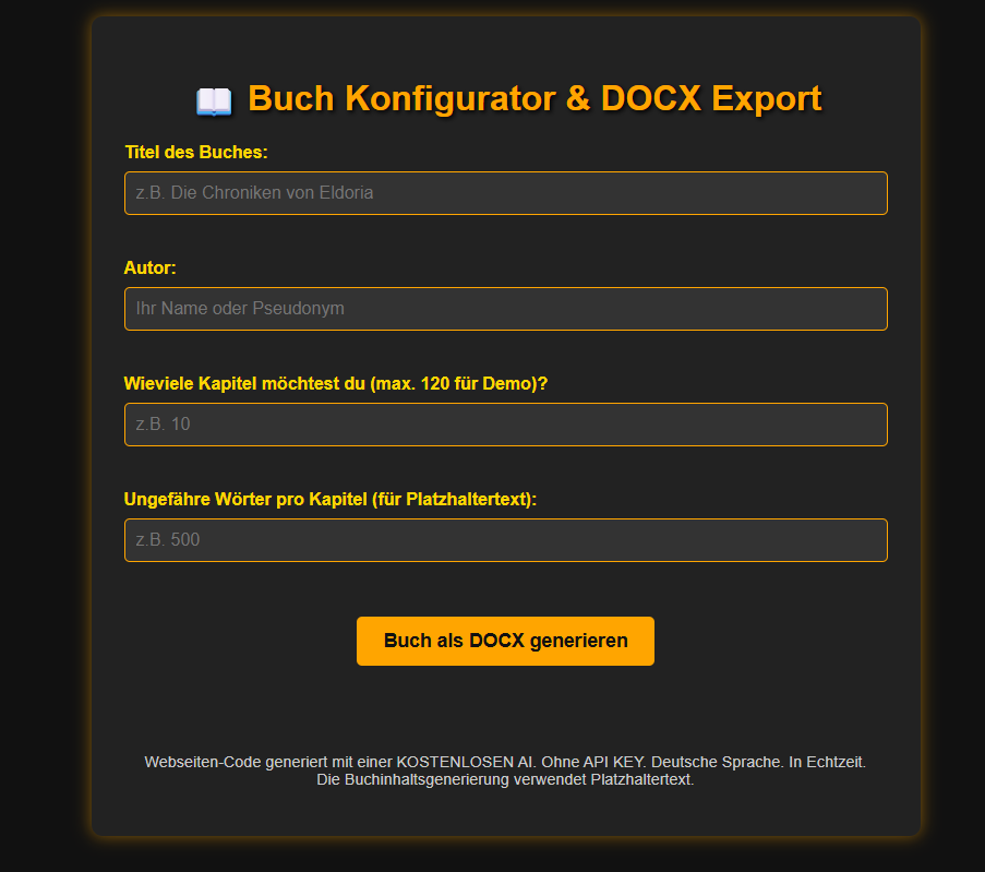 ich arbeite an einem kleinen, clientseitigen Web-Tool und bräuchte eure Unterstützung. Mein Ziel ist es, einen einfachen Buch-Konfigurator zu erstellen, der basierend auf Nutzereingaben (Titel, Autor, Kapitelanzahl, Wörter pro Kapitel) ein DOCX-Dokument generiert und zum Download anbietet.