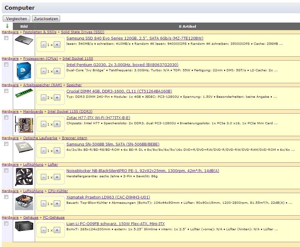 G3220 auf Asus B85M mit C2 Stepping steht grad auf meinem Wunschzettel. Ich hab noch ein altes Silverstone LaScala das ich weiterverwenden will, ebenso wie ne 80 GB SSD, ne 3TB HDD und 4GB DDR3... Also fast alles vorhanden. Aber schon allein wegen der CPU/MB Kombo kannst du ewig rumtun ;-)
