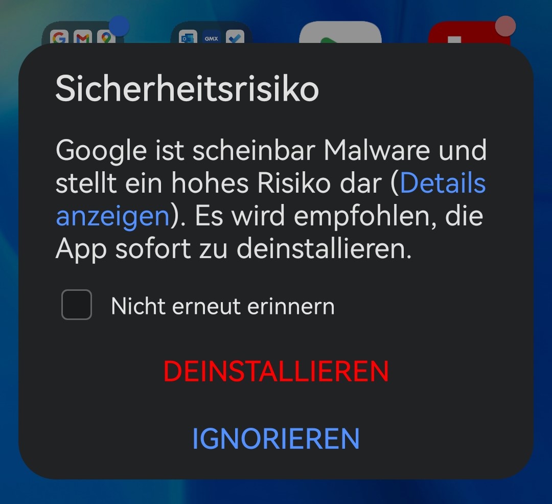 Die Meldung habe ich am Samstag nach einem Update der Apps über den Google Playstore auf meinem Huawei P30 auch gehabt. Hängt wohl mit dem in die Optimizer App integrierten Virenscanner von Avast zusammen. Ich gehe mal von einer False Positive Meldung aus und habe die Aufforderung zum Deinstallieren daher erst einmal ignoriert.