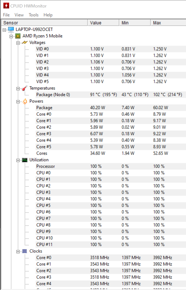 Im Desktop-Betrieb bleibt das Notebook immer sehr kühl, es wird höchstens handwarm. Unter Last fährt Huawei aber knapp unter dem Temperaturlimit. AMD gibt für den Ryzen 5 eine max. Temperatur von 105°C an, ich habe max. 102°C gemessen, wobei sich die Temperatur die meiste Zeit bei ca. 91°C eingependelt hat.