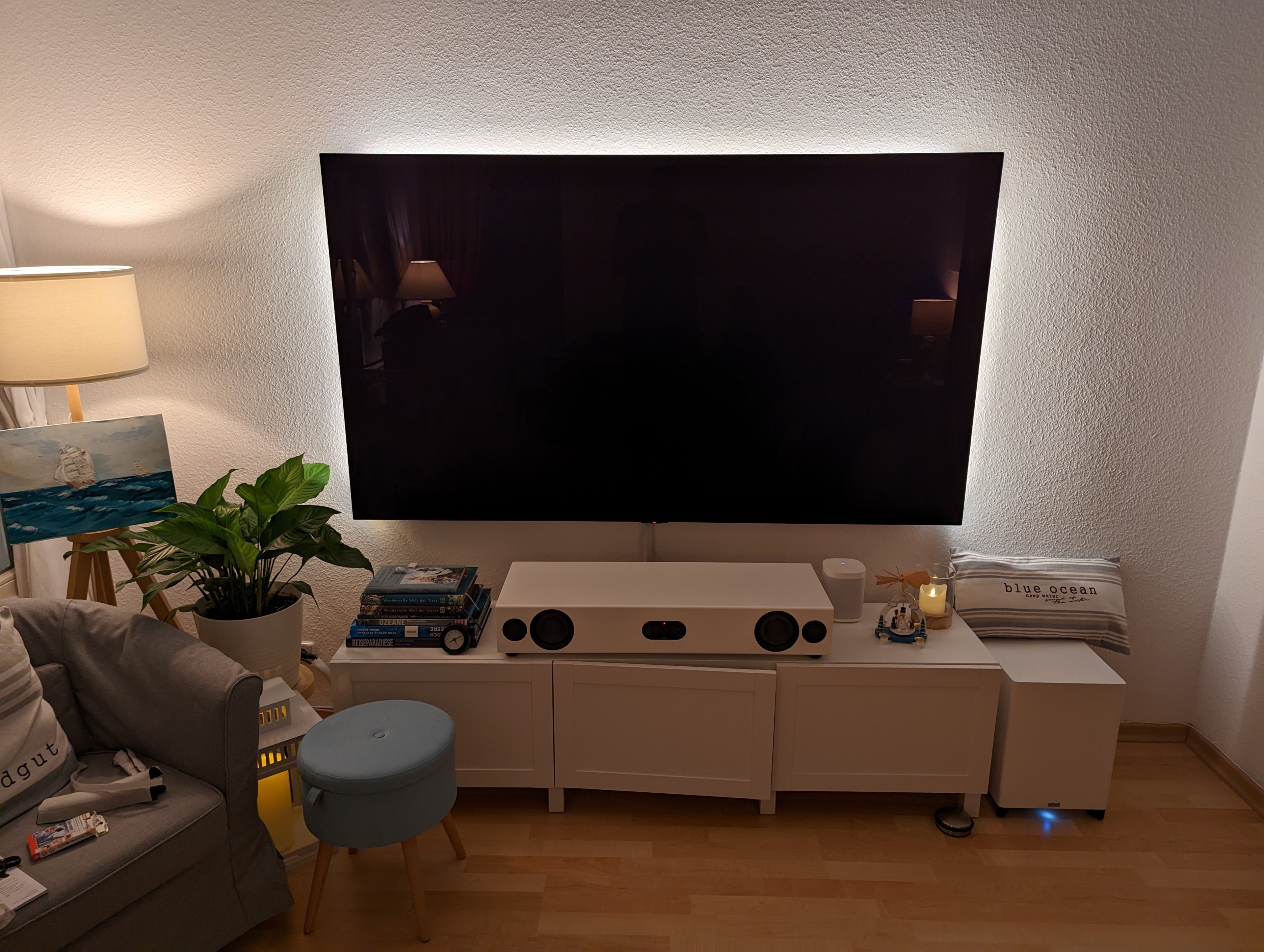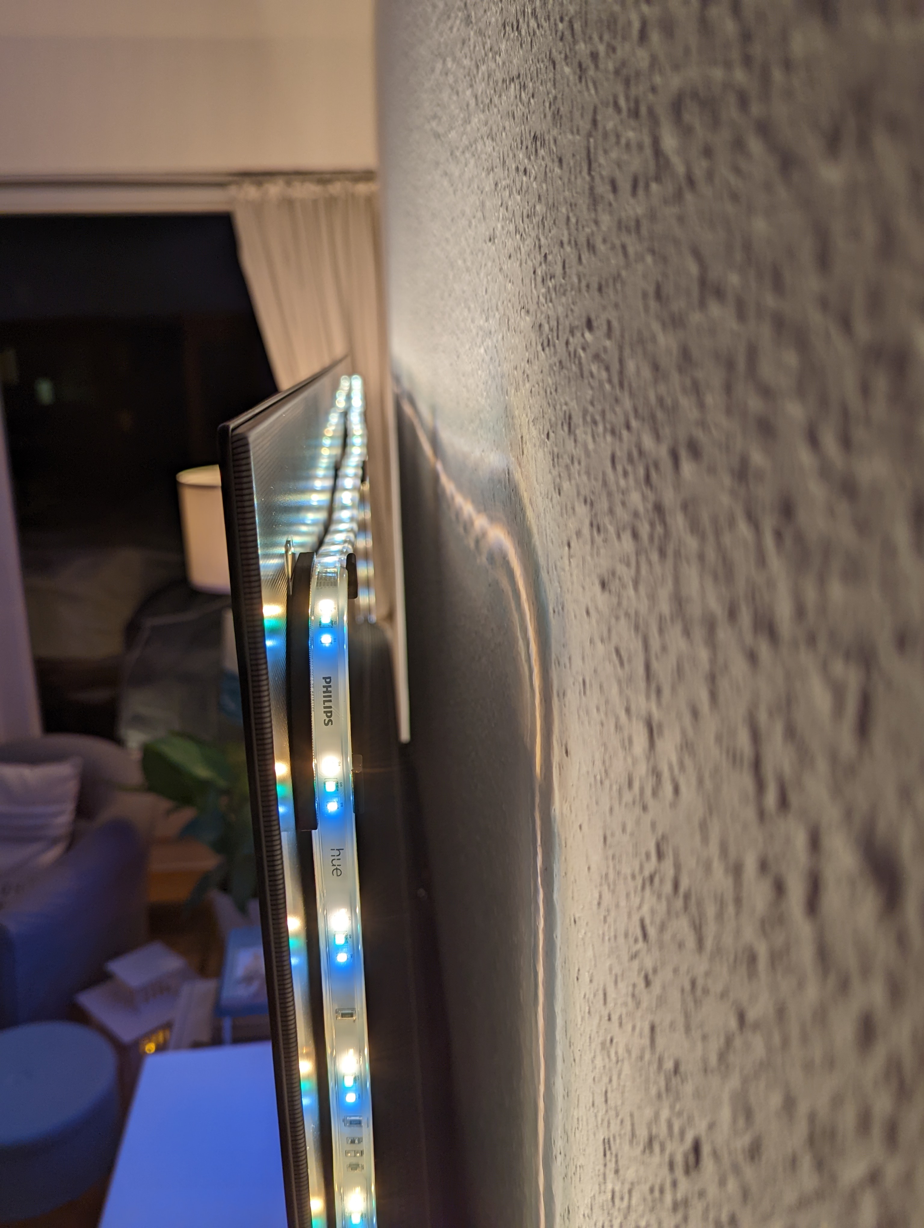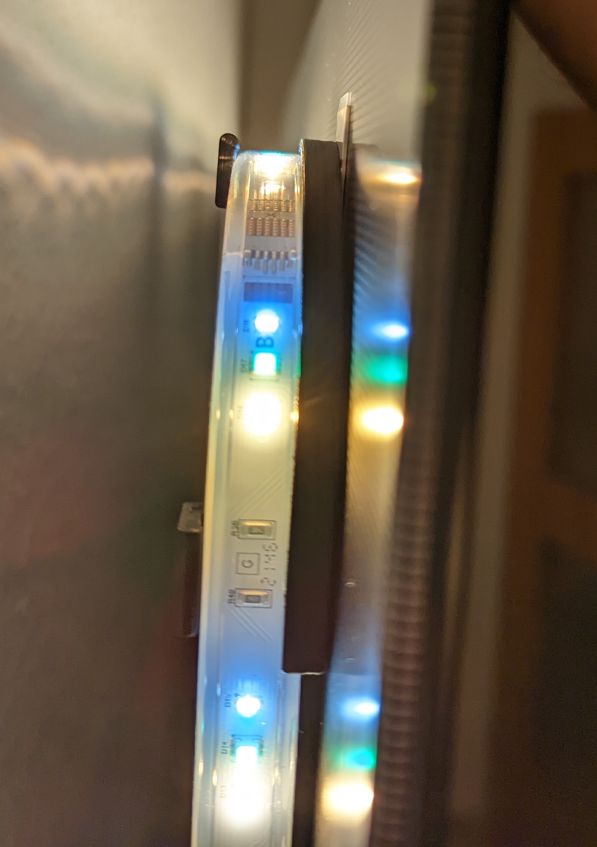 Hi, habe seit paar Tagen nen 83er OLED. Wollte gerade, wie beim alten 65er nen Hue Lightstrip (4m, vorher 2,66m) an der Rückwand befestigen, anders als beim alten TV sind die Knickpunkte des Lightstrip aber nicht an der richtigen Stelle, wenn alle drei Seiten gleich ausgeleuchtet werden sollen. Immer dann, wenn ich auf allen Seiten das richtige Verhältnis (Abstand zur Kante des TVs, links und rechts gleich lang) erreiche, sind an den zu knickenden Stellen LED im Weg. Mir ist aber aufgefallen, dass man links und rechts am dickeren Teil des TVs glatte Flächen hat, die nach außen gehen, so daß man nicht direkt gegen die Wand leuchtet, wie davor. Im oberen Teil hatte ich überlegt, dass man evtl solche kleber benutzen kann, wie sie dem Gradient für TVs beiliegen, siehe Foto unten. Im anderen Bild sieht man, wie es geplant war und vorher bei 65er aussah (Orange) und wie man es dann mit weiterem Radius verbauen könnte (türkis). Gibt es solche Teile, auf die man dann den Lightstrip "legen" kann, hätte ansonsten an Kabelklemme gedacht oder Kleiderhaken.