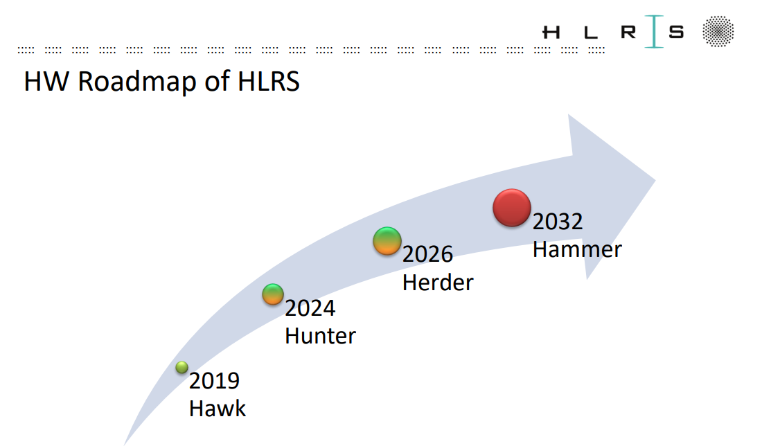 Die Roadmap mit den Namen hatte das HRLS sogar 2022 schon herausgegeben. Damals natürlich noch ohne Details welche Komponenten verwendet werden. Interessant ist auch Hammer für 2032, was dem Namen nach, ja eigentlich ein AMD-System werden muss.