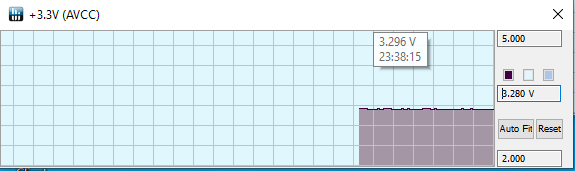 HWinfo zeigt bei +3.3V (AVCC) die Werte 3,28 und 3,296 Volt an. Es schwankt im im 30 Sekunden Takt zwischen diesen beiden Werten.