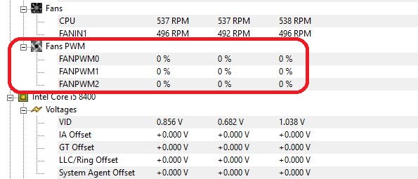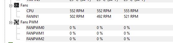 das beobachte ich schon seit einigen Versionen von HWMonitor und bei meinen letzten Boards: es wird immer nur 0 % bei Fans PWM angezeigt, egal wie hoch die Lüfter drehen. Die Lüfter sind PWM, und sitzen auf CPU-Kühler (NB eLoop B12-PS) bzw. Rückseite Gehäuse (beQuiet Silent Wings 3). Im BIOS stehen beide auf PWM, CPU auf lautlos, SysFan 1 Kurve manuell eingestellt.