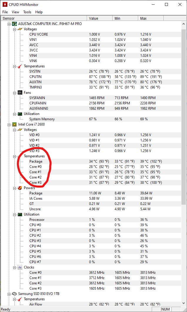 Ich habe meinen alten Rechner vor kurzem wiedermal in betrieb genommen und ihn mit einer SSD und zusätzlichen 8GB Arbeitsspeicher aufgerüstet. Soweit so gut. Durch CPU-Z bin ich dann auf den HWMonitor gestoßen und dachte mir ich könnte ja mal die Temperatur im Auge behalten. Nach ungefähr 10 Stunden Spielzeit habe ich dann einen Blick darauf geworfen und festgestellt dass die Core Temperatur über 120° anzeigt. Das ist komisch da der Rechner über 6 Jahre auf dem Buckel hat und bei diesen Temperaturen bestimmt schon längst den Löffel abgegeben hätte (vermute ich zumindest). Ich muss dazu sagen dass ich die Temperatur vorher nie im Auge hatte und nicht sagen kann ob das neu ist. Etwas sorgen mache ich mir aber trotzdem.