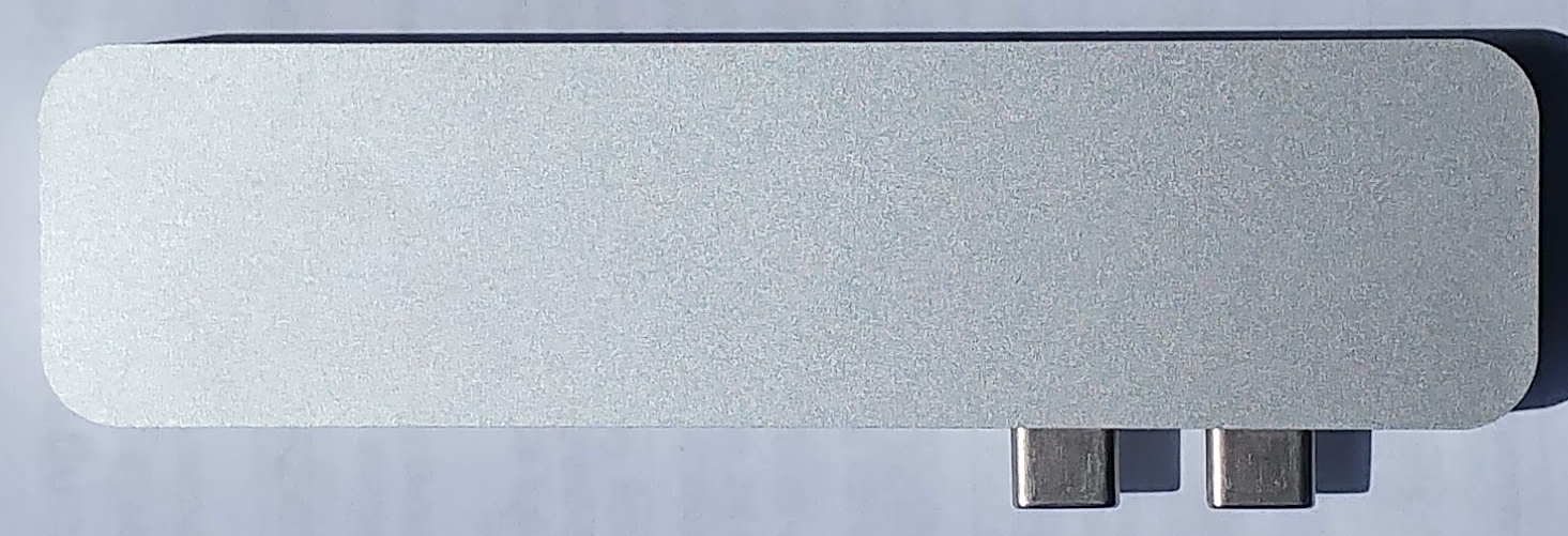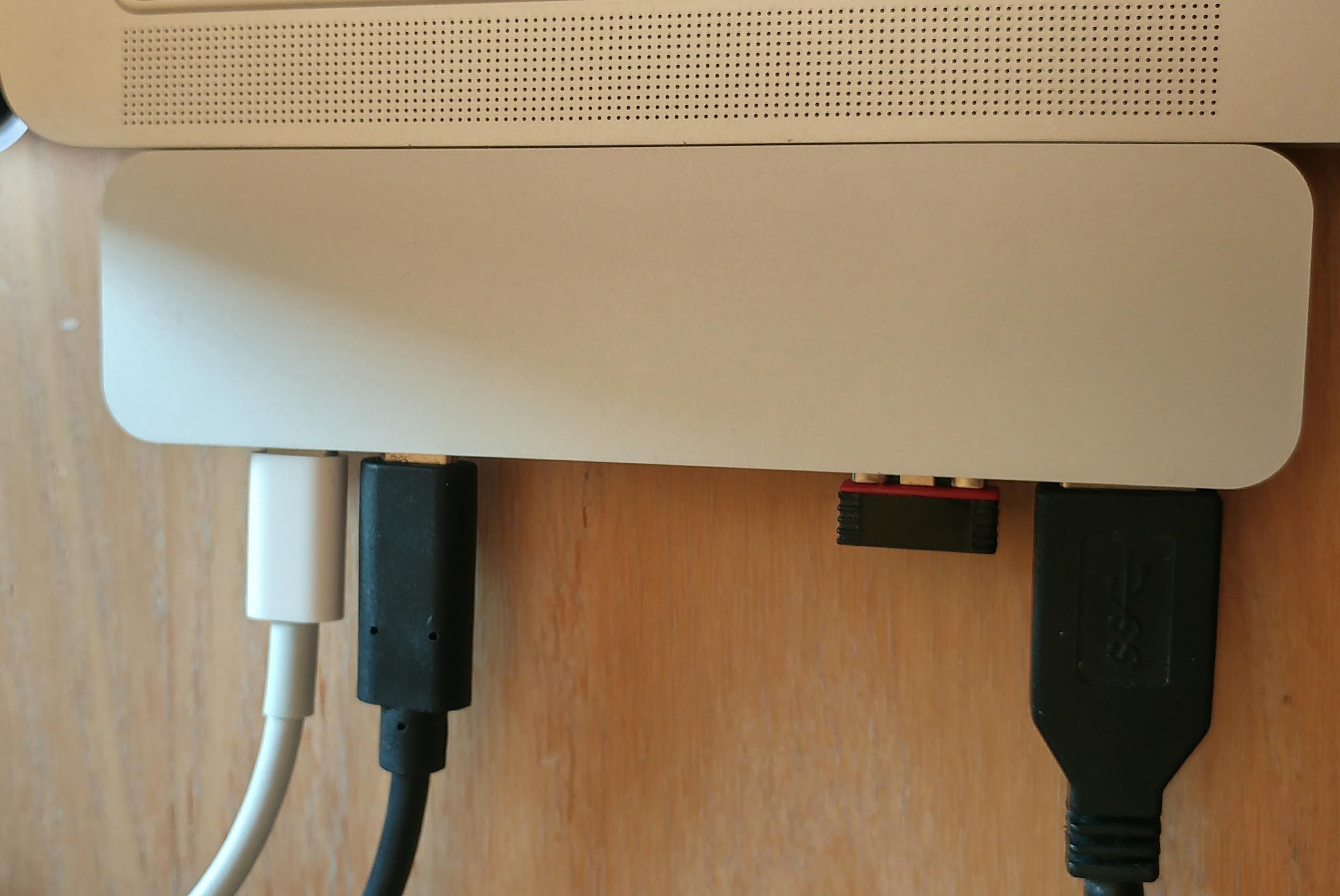 Gut zu sehen sind die beiden zu verwendenden USB-C-Ports, die gegenüberliegenden Anschlüsse am Hyperdrive. Wird auf der anderen Seite mit zwei Adaptern gearbeitet (oder USB-C-Zubehör/Bildschirme etc.) kann mittels durchgeschleiftem Ladeanschluss auch über das Hyperdrive geladen werden.