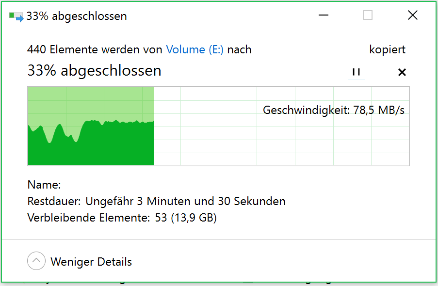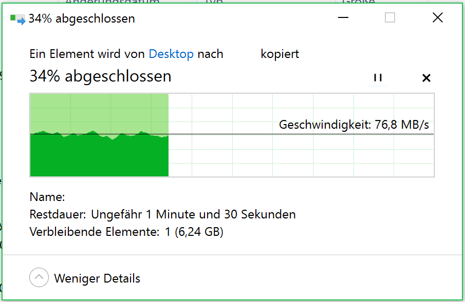 Das Kopieren von einer "nackten", per Sata-2-USB-Adapter angeschlossene 2,5" HDD auf besagter USB 3-Externe (3,5") hängt bei irgendwie um die 78-80 MB/s fest. Schneller scheint es nicht zu werden.