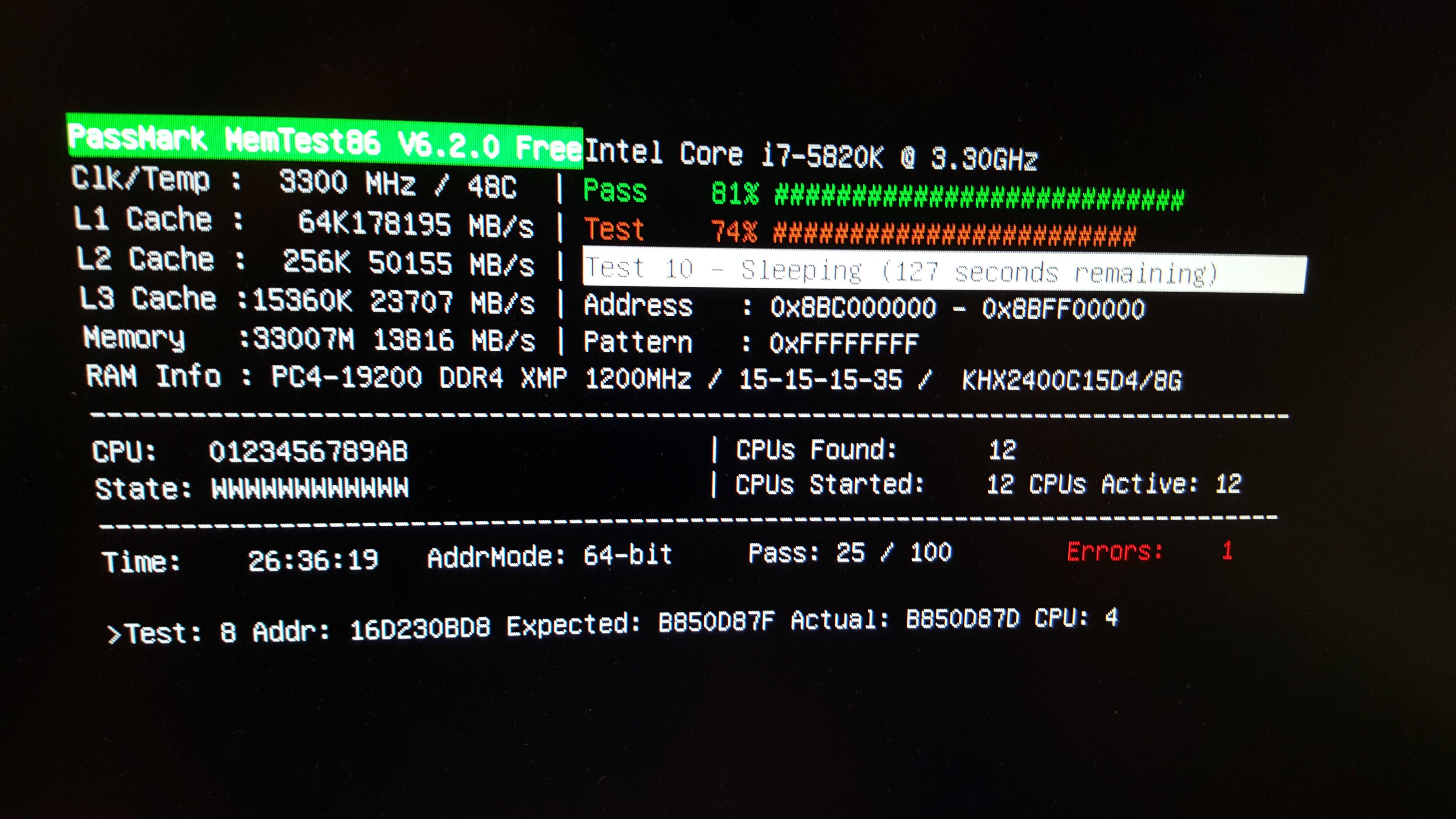 Laut Hersteller Kompatibilitätsliste ist der HX430C15PB2K4/16 dort aufgeführt, sogar beide XMP Profile. Mein Problem ist jedoch dass ich den RAM nicht über den default-clock von 2133mhz bekomme. Sobald das XMP#1 Profil (3000mhz @ CL15) bzw XMP#2(2666mhz @CL14), beide 1,35 Volt, aktiviere, bekomme ich noch sofort einen Bluescreen nach dem Bootscreen (Memory Management). Manuelle anpassen der Timings bzw. dem Clock, selbst auf 2400, niedrigere CL, resultiert immer im selben. Liegt ein Defekt vor?