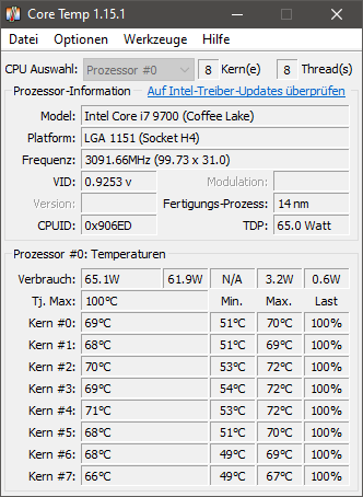 ich habe jetzt Prime (Stresstest für alle Kerne) laufen lassen und die maximalen Temperaturen betragen 73 Grad und die Lüfter sind kaum hörbar.