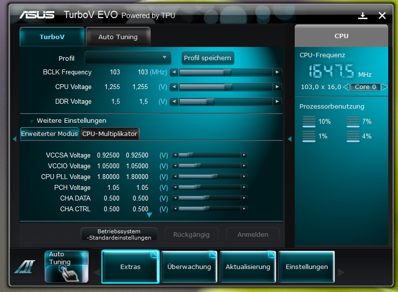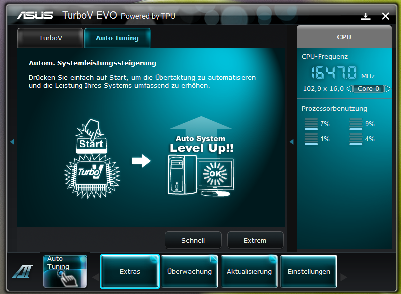 Mittels des Win7 74bit ASUS Tools (ASUS TurboV EVO) kann man mittels One-Click das System auf "schnell" oder "Extrem" hochzüchten (Screenshot