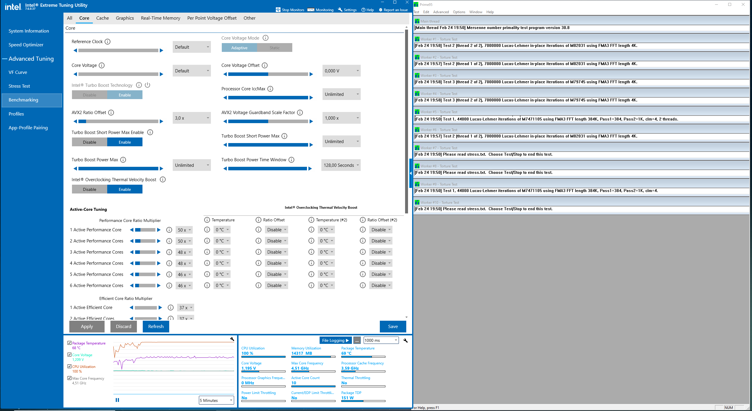 Hab mal Prime95 gestartet, da säuft er auch seine 150 Watt und bleibt bei unter 70 Grad (bei AiO 80%, Arctic Liquid II 240mm und 4 weiteren Gehäuselüftern) Sind die Intel Einstellungen so in Ordnung?