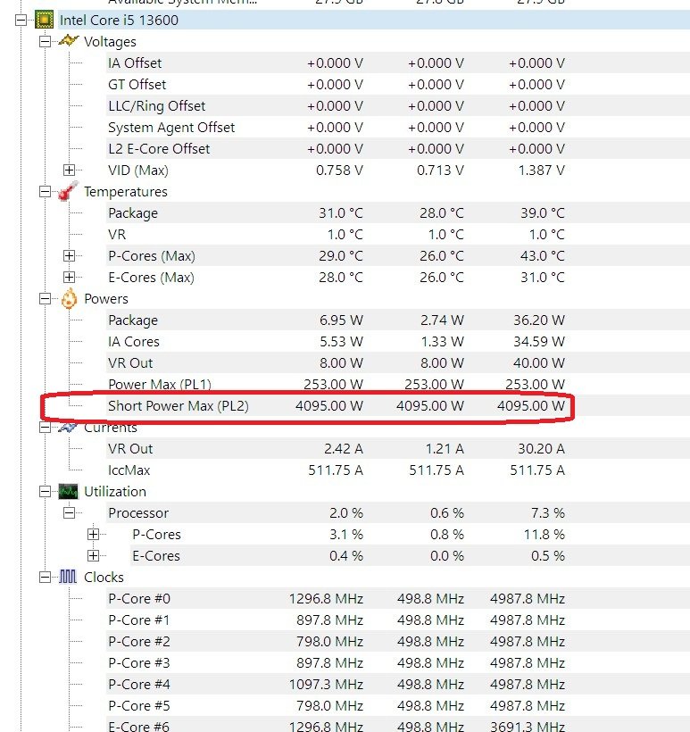 Beim i5-13600 - zeigt HWMonitor Short Power Max PL2 mit 4.096 Watt an, gut zum Heizen