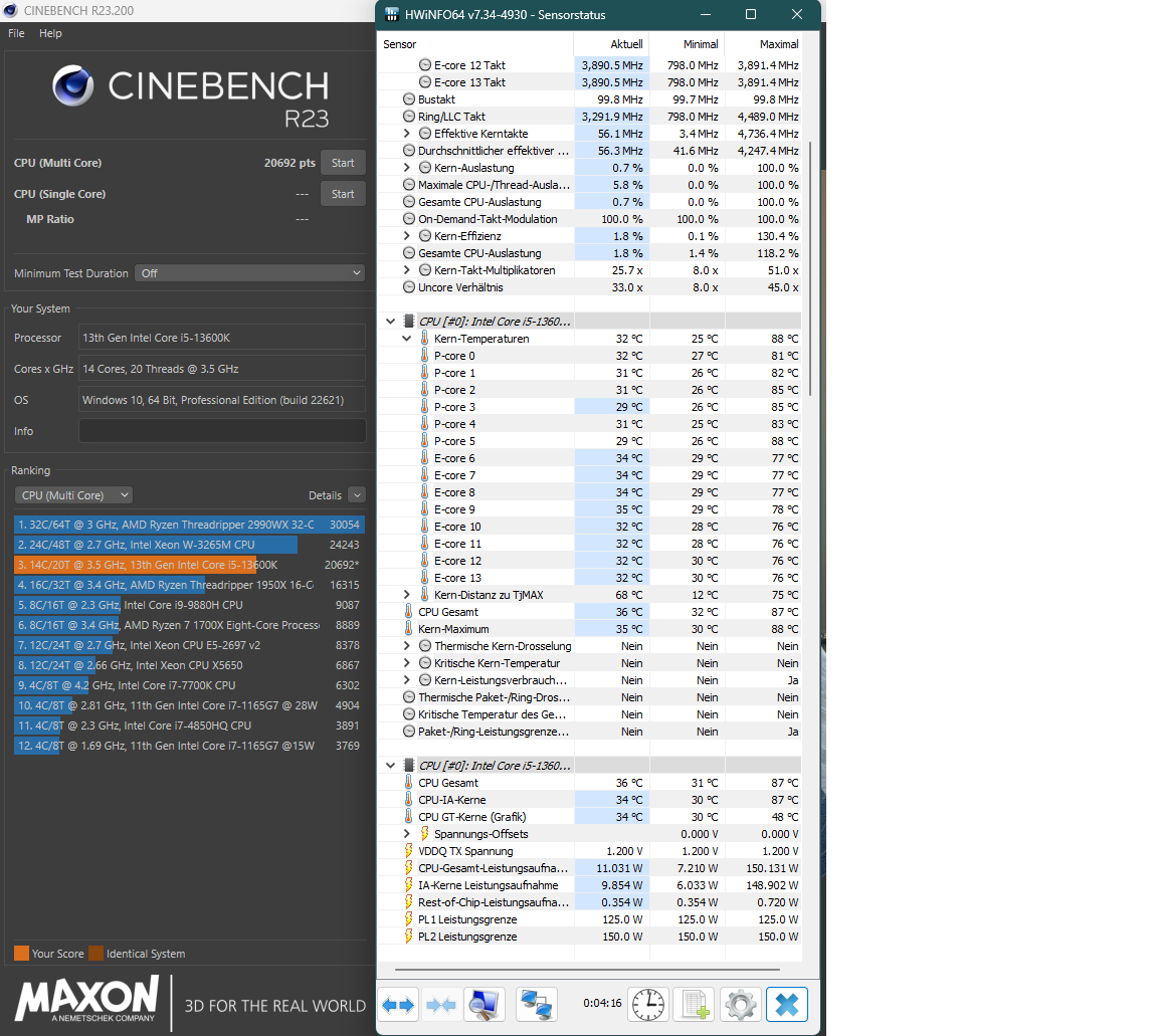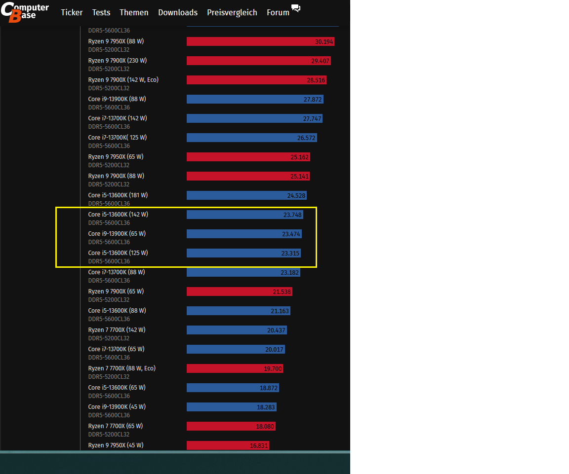 Hat der Arbeitsspeicher eigentlich auch einen Kleinen Einfluss auf Cinebench? Man liest immer, dass das fast irrelevant sei. Allerdings habe ich jetzt gerätselt, wieso ich im R23 selbst mit 150W (CPU drosselt dann nicht, max. 90 Grad) nur auf 22.000 Punkte komme. Laut Computerbase müsste der 13600K mit 142W auf 24.000 Punkte kommen.