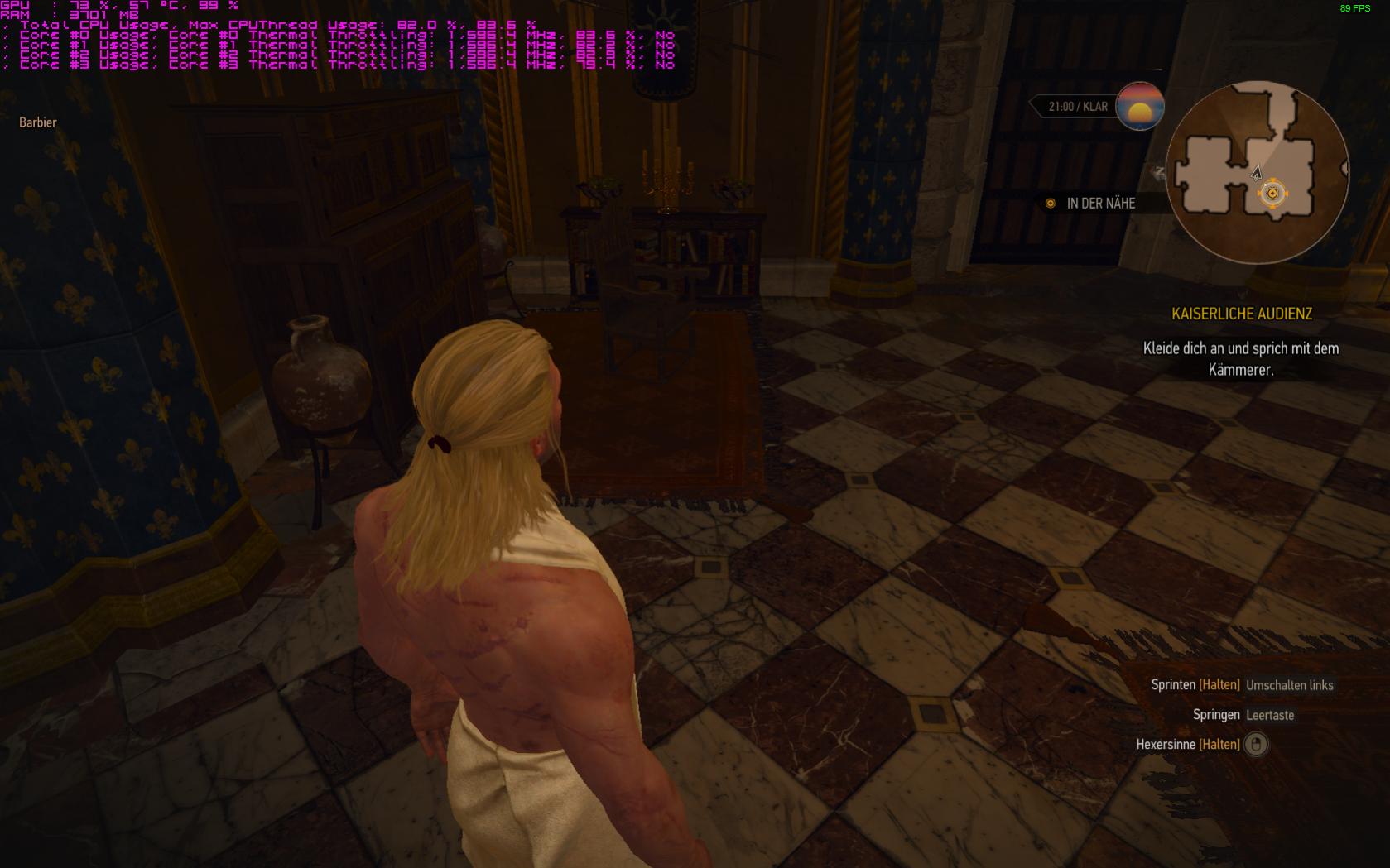FPS: ca. 60 bei mittleren Einstellungen. Jedoch kommt es bei Bewegung/mehreren NPCs/Bewegen zu perversen Frameeinbrüchen im Bereich von 30 FPS - 86 FPS.