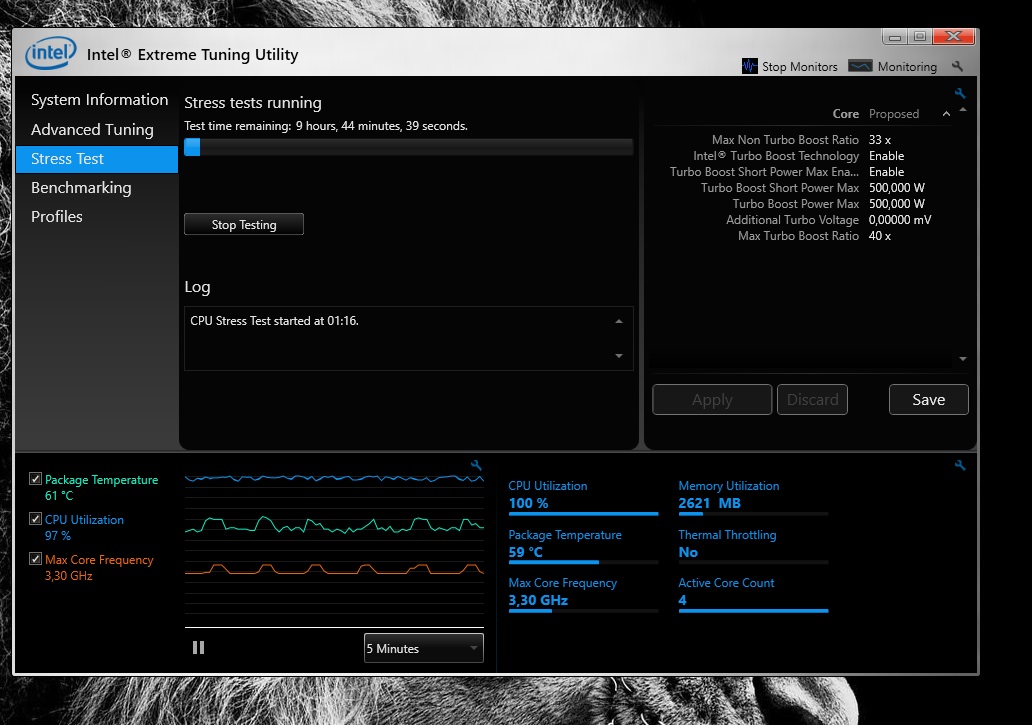 Mein größtes Problem aber, der Prozessor Taktet noch ca. 2-3 Minuten Volllast (Prime95 oder Intel Utility) die meiste Zeit auf 3,3 GHZ runter.