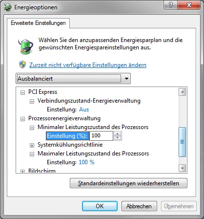 Ich weiß das ein schwanken des Core Speeds durch "falsche" Energieoptionen in den Windows Systemsteuerungen verursacht werden können, daher habe ich diese auf "Höchstleistung" gestellt, wie hier zu sehen ist: