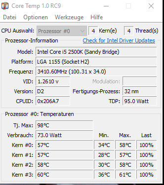 Die Kerne 2 und 3 haben in der letzten halben Stunde zwischen 65 und 67 Grad geschwankt.