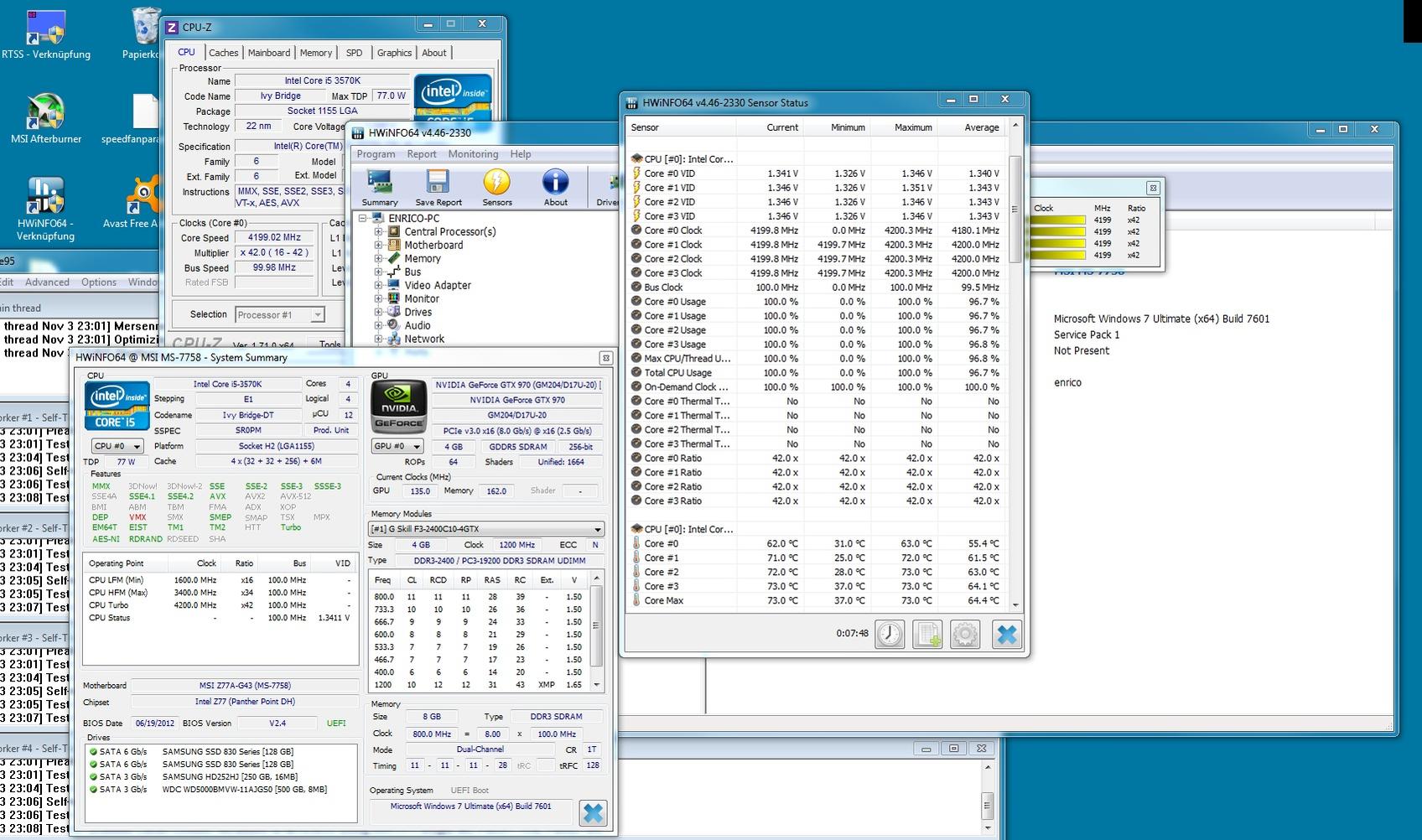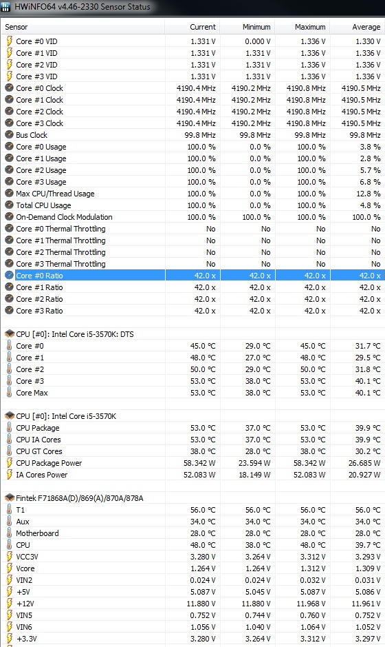 darf ich hier kurz eine Frage einwerfen? Mein 3570k läuft mit 4,2Ghz und 1.3 V. Die Temps sehen ganz ok aus mMn. Stresstests soweit überstanden, allerdings hat hier ein Teil des Systems eine Temp von 53°(Fintek f7??) im Normalbetrieb. Das macht mir ein bißchen Sorgen, oder sind die Temps eh ok? (anbei ein Screenshot.) Könnte man was optimieren? Vcore runterdrehen?