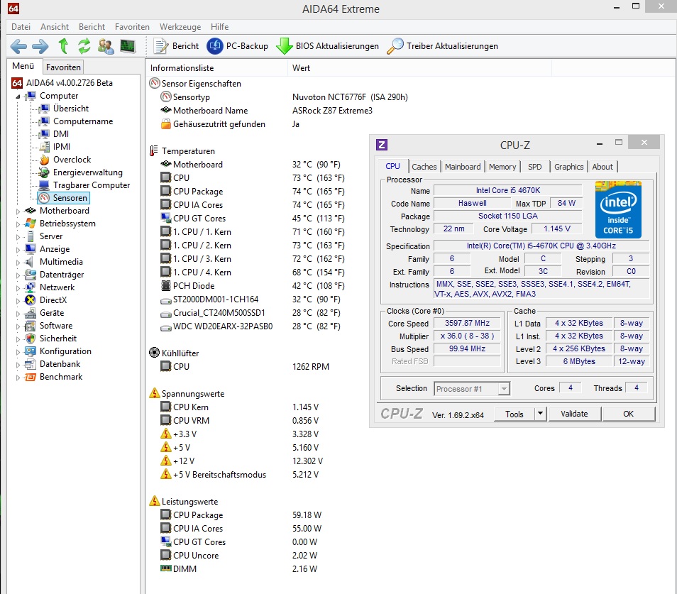 Auffälig das im IDLE die Temperatur eigentlich sehr gut ist. Sobald sie unter Last steht, kratzt sie die 75 Grad. Aber geht nie drüber. Das wäre für den boxed Kühler von Intel sogar schon eine schlechte Leistung.