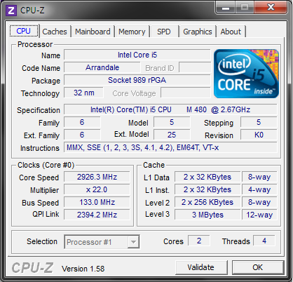 Selbstverständlich vertraue ich dem System nicht allzu sehr, deshalb schau ich in CPU-Z nach: Auch hier ist ein i5-480M aufgelistet: