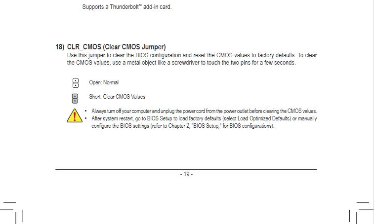 Die Information zu Clear CMOS aus dem Handbuch. Die Pins können mit einem Jumper oder einem anderen spannungsleitenden Gegenstand gebrückt werden.