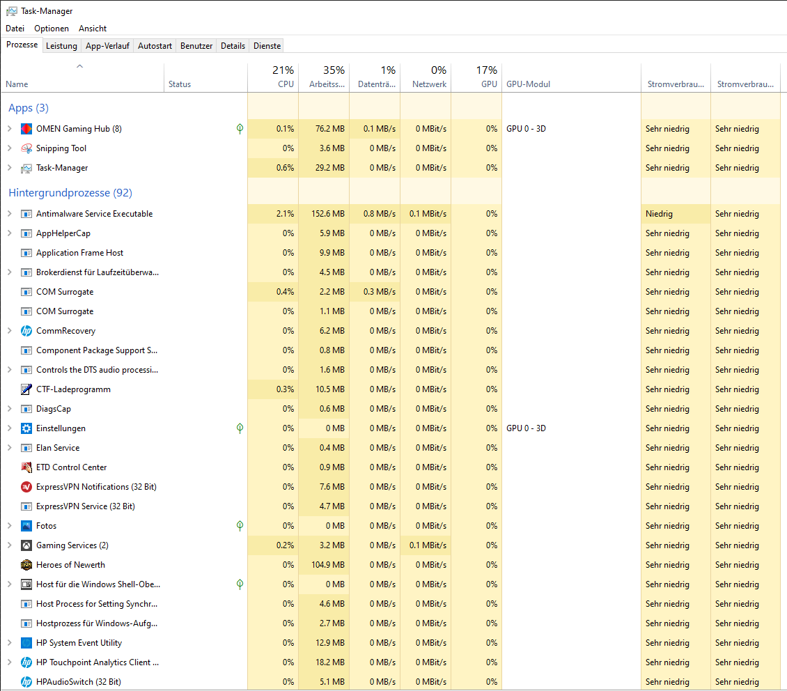 Soweit so gut, leider zeigt er mir non stop 4,2-4,5 GHZ an. energieoptionen ausbalanciert habe ich sogar min 1% und max 99% gestellt, d.H er sollte bei 99% überhaupt nicht auf Max booten richtig ? War zumindest bei 20 anderen Laptops und PCs vorher der Fall. Könnte es sein das ein anderes Programm den Prozessor pusht ? Habe Mcaffee direkt runtergeworfen, im HP Omen Gaming Hub habe ich auf Komfort gestellt, ansonsten bisher so gut wie nichts installiert geschweige denn läuft irgendetwas nebenbei.