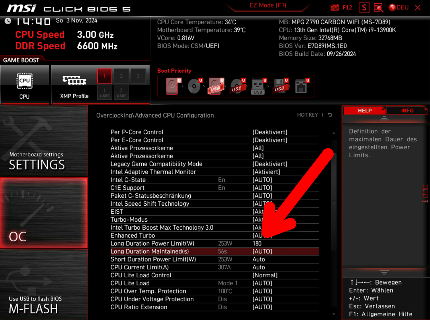 Mit einem neuen Board von MSI und der neuen Bios Version ist mit Default das erste Profil wie auf dem Bild zu sehen ausgewählt. Hiermit wird für P1 und P2 jeweils 253 Watt gesetzt, was aber auch selbst nochmals nachbearbeitet werden kann.
