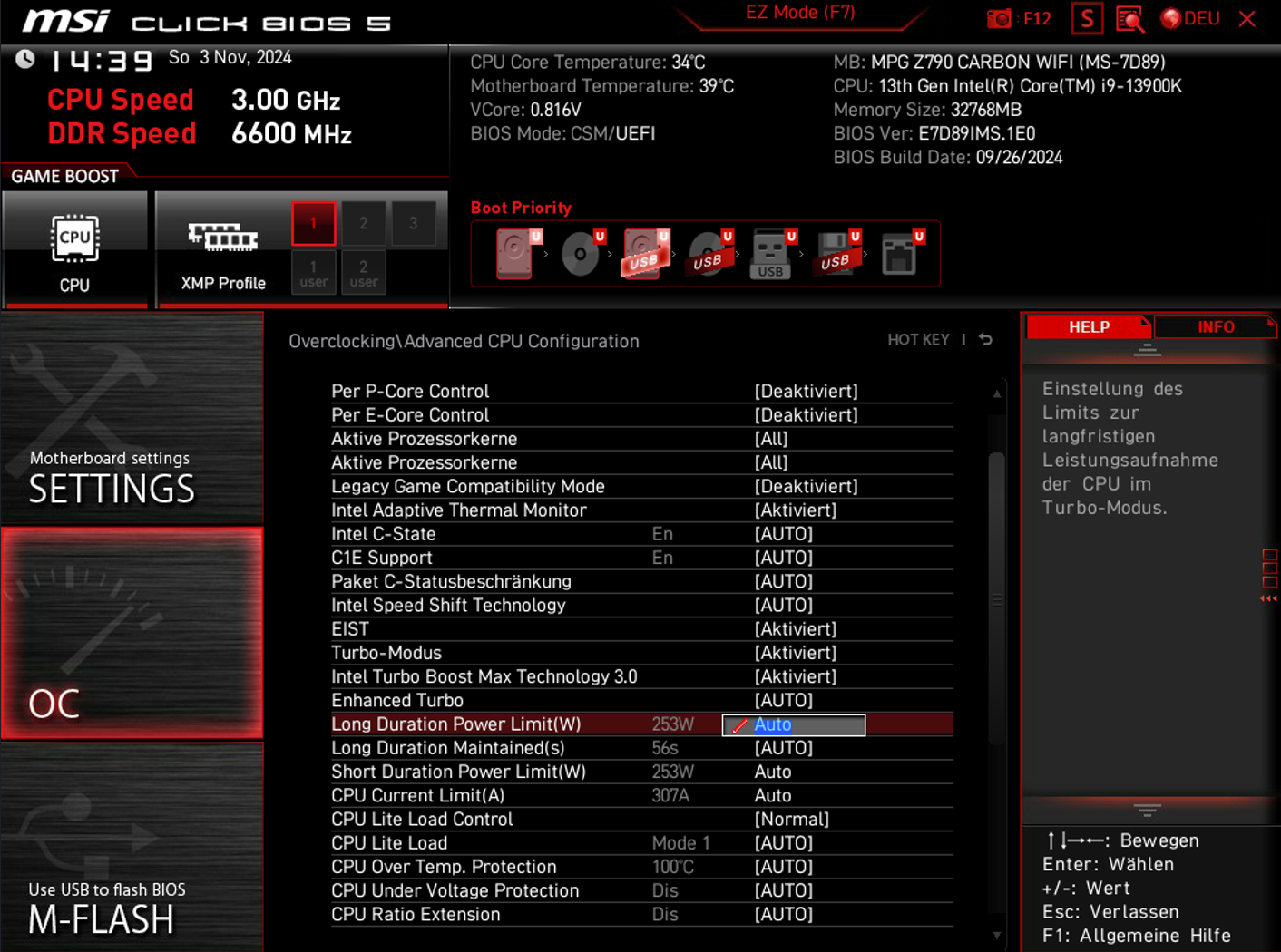 Dieses Mainboard hat mein Sohn verbaut. Ich hatte zuvor auch das Edge Z690 Board mit DDR4 verbaut und habe im Juli, dieses Jahres, auf den Carbon Z790 Mainboard mit DDR5 umgerüstet. Mit diesen Boards wird mit Default 253 Watt mit P1 und P2 gesetzt. Limits lassen sich auch problemlos selbst bestimmen.