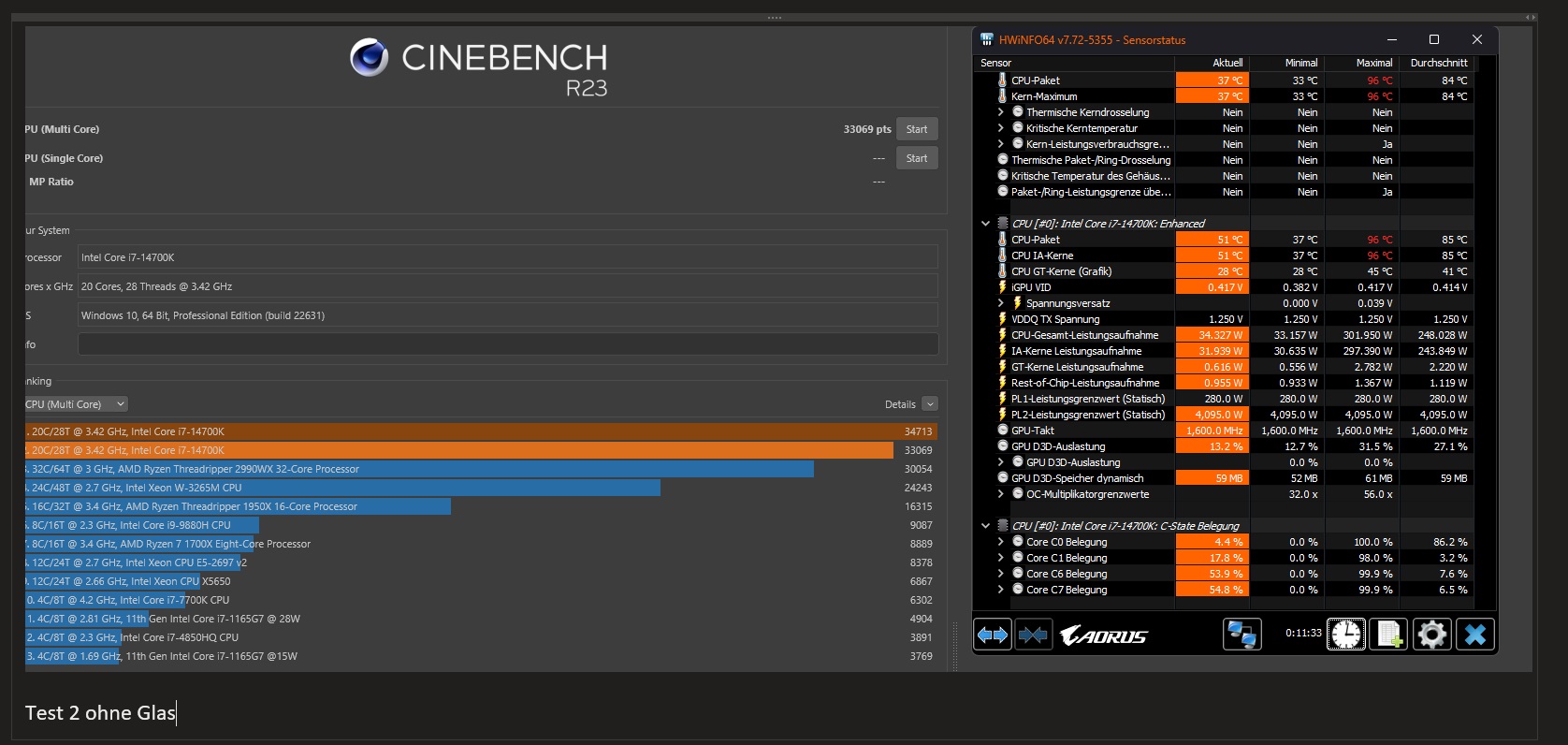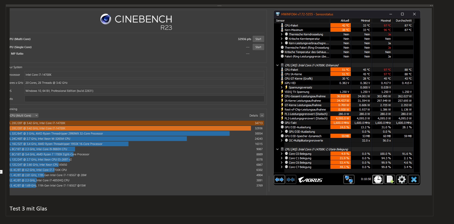 Und was schlimmer ist, die Temperatur geht hoch bis 100 Grad im ersten Test (mit Glas) und als ich das Glas einmal weg gelassen habe, waren es immer noch 96 Grad und beim dritten Test wieder 97 Grad. Einmal wurde die CPU sogar gedrosselt.