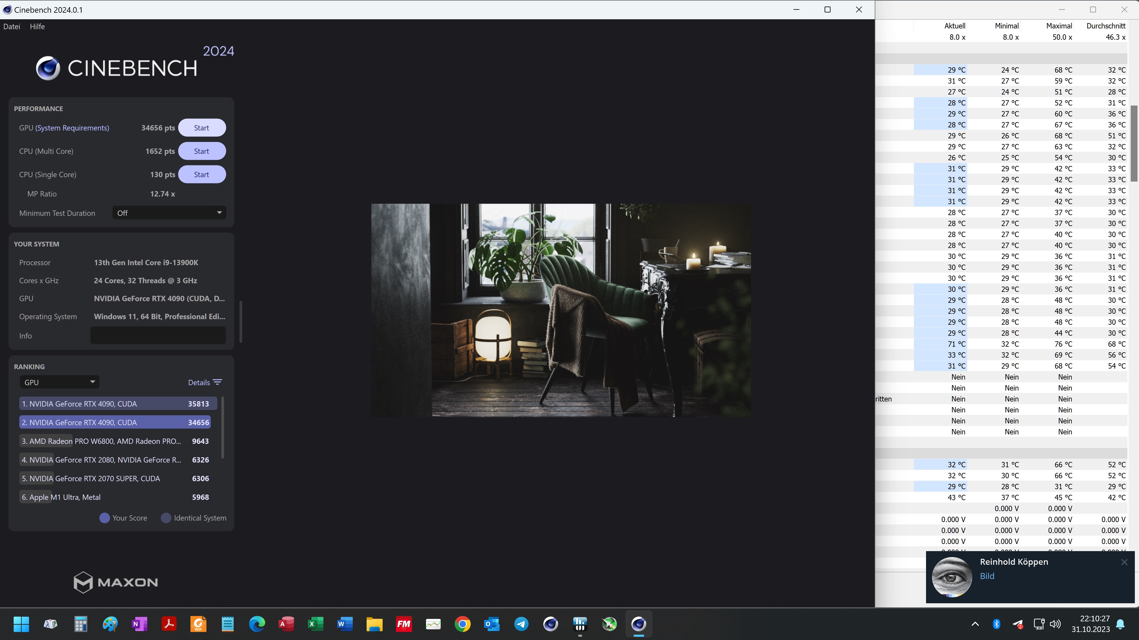 Habe mir heute Nachmittag Cinebench 2024 heruntergeladen, um die Leistung meiner neuen CPU zu testen. Dabei erreichte mein i7-14700k während dem Multi-Core-Test extrem hohe Temperaturen von ca. 100 Grad Celsius.