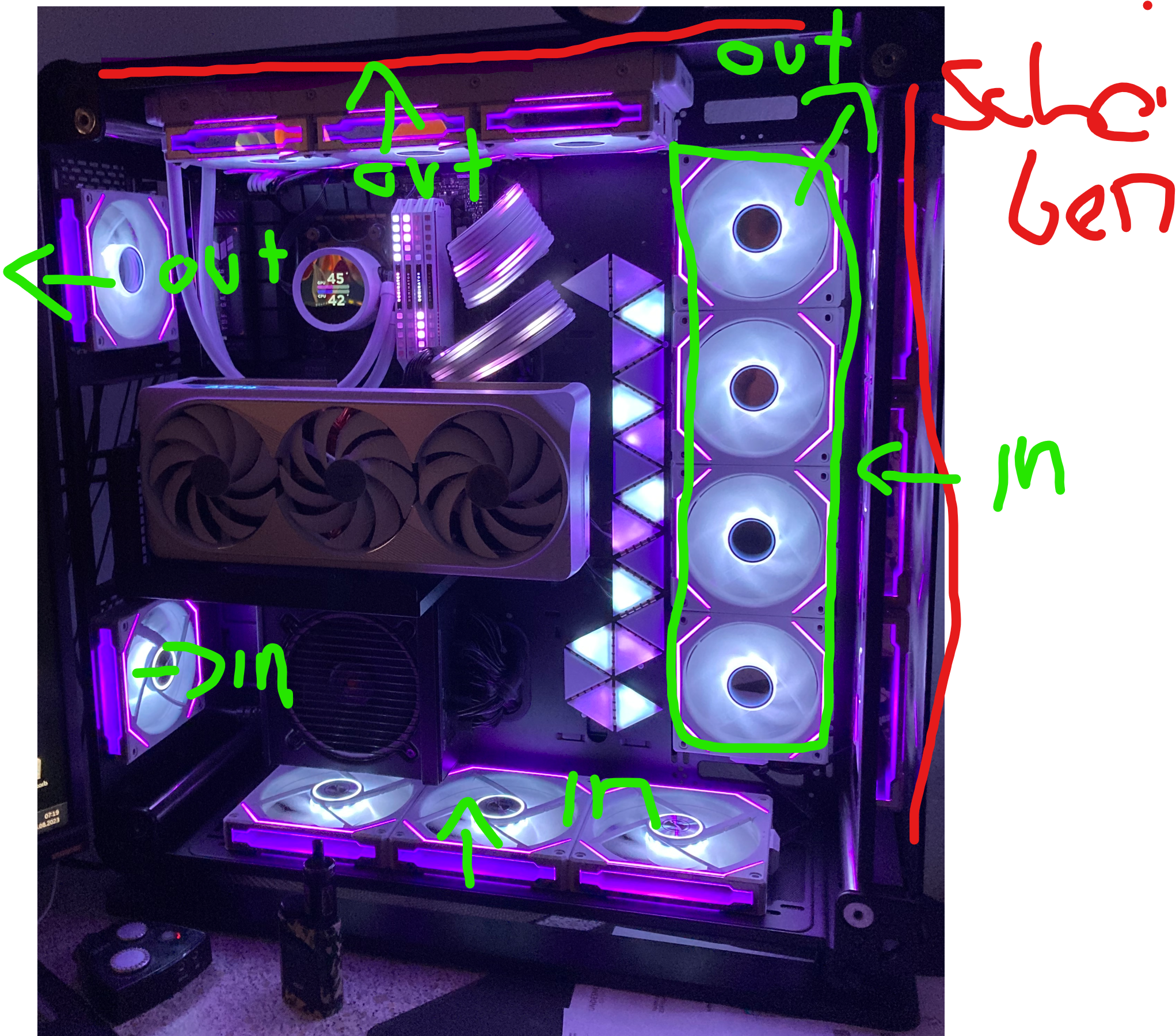 Das Gehäuse ist in meinem früheren Post ersichtlich und dem vom TE sehr ähnlich , überall Scheiben (auch oben) , also schwierige Ausgangslage. 11 Intakes und 4 Outtakes = Überdruck, davon 3 Outtakes durch Scheibe beeinträchtig, ebenso 3 Intakes.