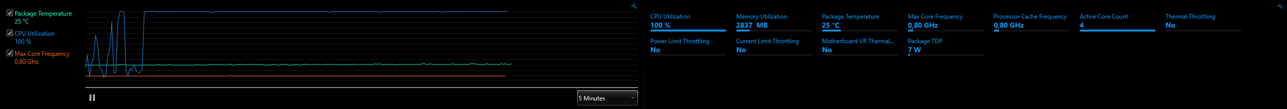 die CPU läuft stur auf 800 MHz ? mal mit HWinfo64 oder besser Intel XTU checken ob Thermal Throttling angezeigt wird auch wenn die Temps. OK sind..