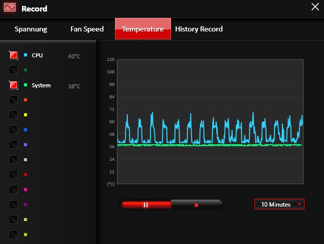 Mir ist dann beim Beobachten der Temperaturen folgendes aufgefallen. (Siehe Bild) Die Temperatur schwankt im Idle Betrieb ständig hoch und runter.